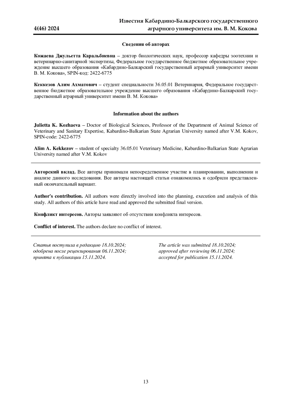 Работа выполнена на базе ТОО «Беркут» Республики Казахстан на молодняке крупного рогатого скота с целью сравнительной оценки обменных процессов в организме телят на фоне применения в рационе кормления пробиотиков РуминПро и Актисаф. Добавка дрожжевых пробиотиков РуминПро и Актисаф в рационе телят молочного периода в дозе 3 г/гол. в сутки показало их положительное влияние на уровень ферментативной активности микробиома рубца в его ферментации легко и трудно расщепляемых углеводов, а также протеолитической активности. При этом РуминПро обеспечил повышение в химусе рубца общего белка на 13%, в том числе белкового азота - на 20,1%, а ЛЖК - на 15%, в то время как с Актисафом различие составило 5,8%, 9,1 и 7,0% соответственно. Снижение уровня аммиака в содержимом рубца в группе с добавкой РуминПро на 14,8% показало его большее поступление в печень для синтеза белка, в группе с Актисаф - различие составило только 6,9%. За период выращивания в организме телят с добавкой РуминПро отмечена более высокая белковосинтезирующуя функция печени и повышение содержания общего белка в крови от 0,6 до 5,6%, оптимизация отношения альбумина к глобулину (1,3). Пробиотики в обеих группах телят повысили щелочной резерв крови, уровень каротина в крови и не оказали отрицательного влияния на минеральный обмен кальция, фосфора и магния. Добавка РуминПро увеличила живую массу телят к шестимесячному возрасту на 4,9%, Актисаф - на 1,7%. Среднесуточный прирост молодняка с использованием РуминПро превосходил контрольную группу на 5,76% (Р≤0,001), с Актисаф - на 1,71% (Р≤0,001), что позволило повысить рентабельность производства живой массы телят молочного периода выращивания на 2,7% и на 0,5% соответственно.