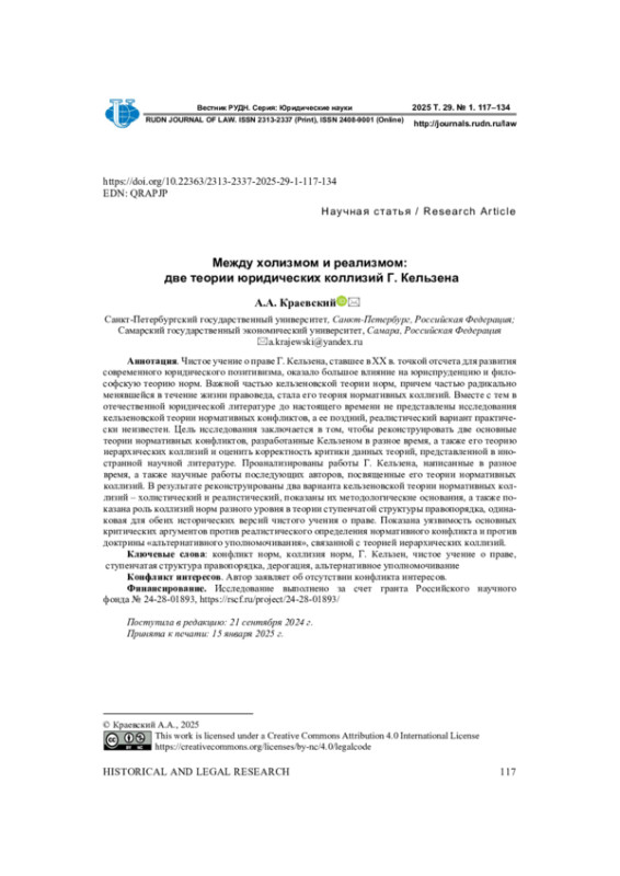 Чистое учение о праве Г. Кельзена, ставшее в XX в. точкой отсчета для развития современного юридического позитивизма, оказало большое влияние на юриспруденцию и философскую теорию норм. Важной частью кельзеновской теории норм, причем частью радикально менявшейся в течение жизни правоведа, стала его теория нормативных коллизий. Вместе с тем в отечественной юридической литературе до настоящего времени не представлены исследования кельзеновской теории нормативных конфликтов, а ее поздний, реалистический вариант практически неизвестен. Цель исследования заключается в том, чтобы реконструировать две основные теории нормативных конфликтов, разработанные Кельзеном в разное время, а также его теорию иерархических коллизий и оценить корректность критики данных теорий, представленной в иностранной научной литературе. Проанализированы работы Г. Кельзена, написанные в разное время, а также научные работы последующих авторов, посвященные его теории нормативных коллизий. В результате реконструированы два варианта кельзеновской теории нормативных коллизий - холистический и реалистический, показаны их методологические основания, а также показана роль коллизий норм разного уровня в теории ступенчатой структуры правопорядка, одинаковая для обеих исторических версий чистого учения о праве. Показана уязвимость основных критических аргументов против реалистического определения нормативного конфликта и против доктрины «альтернативного уполномочивания», связанной с теорией иерархических коллизий.