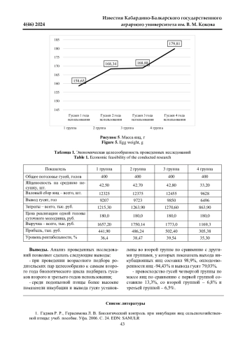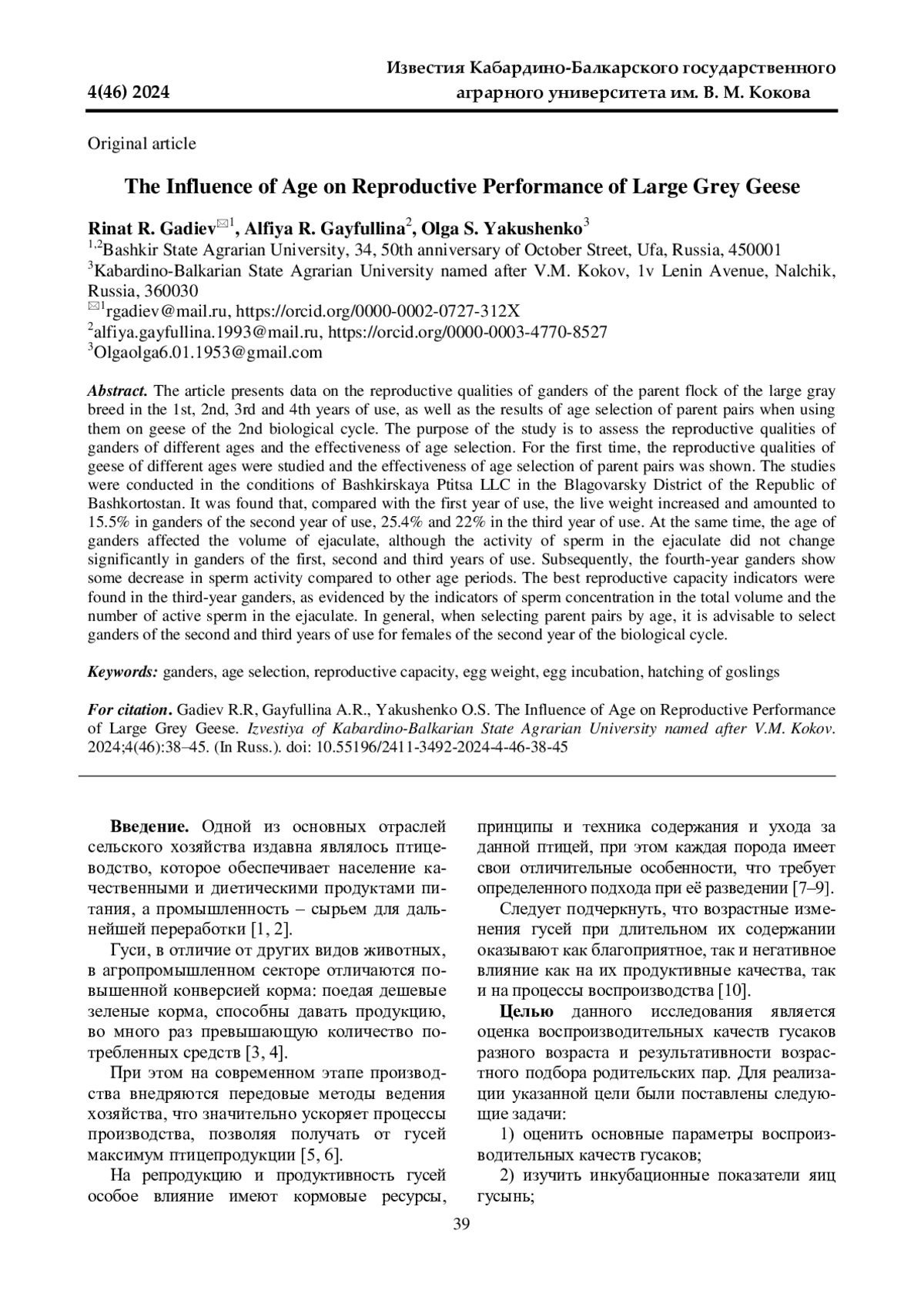 7. 	Гришина Д. С. Оценка хозяйственно-полезных качеств гусей генофондного стада // Владимирский земледелец. 2022. № 4(102). С. 64-69. DOI: 10.24412/2225-2584-2022-4-64-69 EDN: IRFKTN
