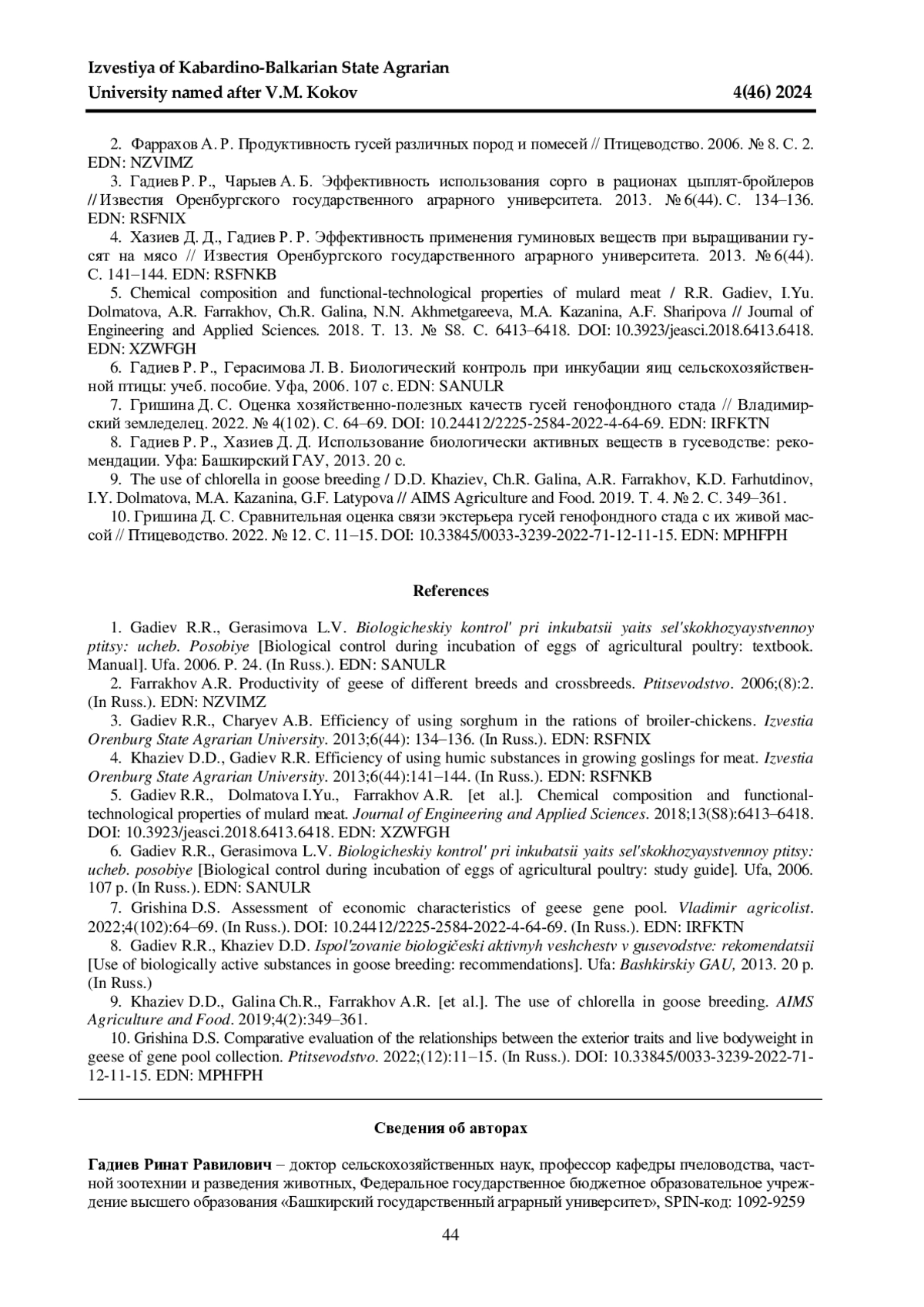 8. 	Гадиев Р. Р., Хазиев Д. Д. Использование биологически активных веществ в гусеводстве: рекомендации. Уфа: Башкирский ГАУ, 2013. 20 с. EDN: PPMIHR