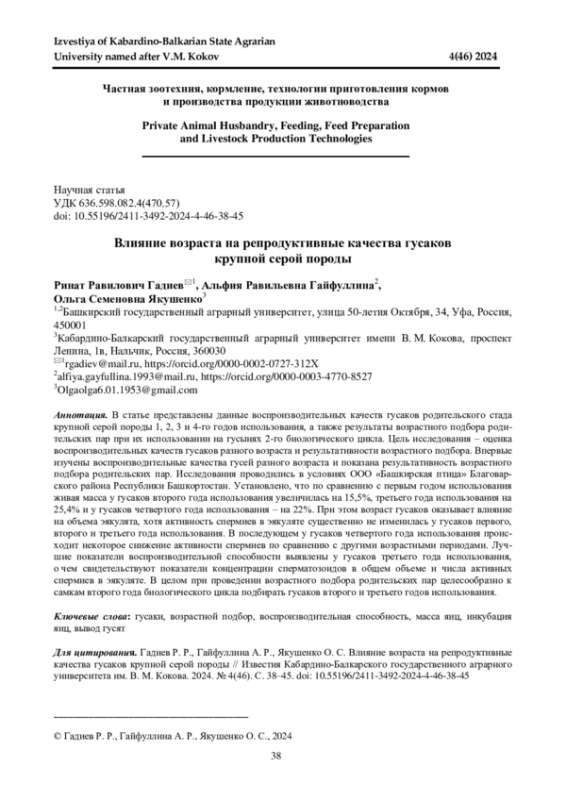 В статье представлены данные воспроизводительных качеств гусаков родительского стада крупной серой породы 1, 2, 3 и 4-го годов использования, а также результаты возрастного подбора родительских пар при их использовании на гусынях 2-го биологического цикла. Цель исследования - оценка воспроизводительных качеств гусаков разного возраста и результативности возрастного подбора. Впервые изучены воспроизводительные качества гусей разного возраста и показана результативность возрастного подбора родительских пар. Исследования проводились в условиях ООО «Башкирская птица» Благоварского района Республики Башкортостан. Установлено, что по сравнению с первым годом использования живая масса у гусаков второго года использования увеличилась на 15,5%, третьего года использования на 25,4% и у гусаков четвертого года использования - на 22%. При этом возраст гусаков оказывает влияние на объема эякулята, хотя активность спермиев в эякуляте существенно не изменилась у гусаков первого, второго и третьего года использования. В последующем у гусаков четвертого года использования происходит некоторое снижение активности спермиев по сравнению с другими возрастными периодами. Лучшие показатели воспроизводительной способности выявлены у гусаков третьего года использования, о чем свидетельствуют показатели концентрации сперматозоидов в общем объеме и числа активных спермиев в эякуляте. В целом при проведении возрастного подбора родительских пар целесообразно к самкам второго года биологического цикла подбирать гусаков второго и третьего годов использования.