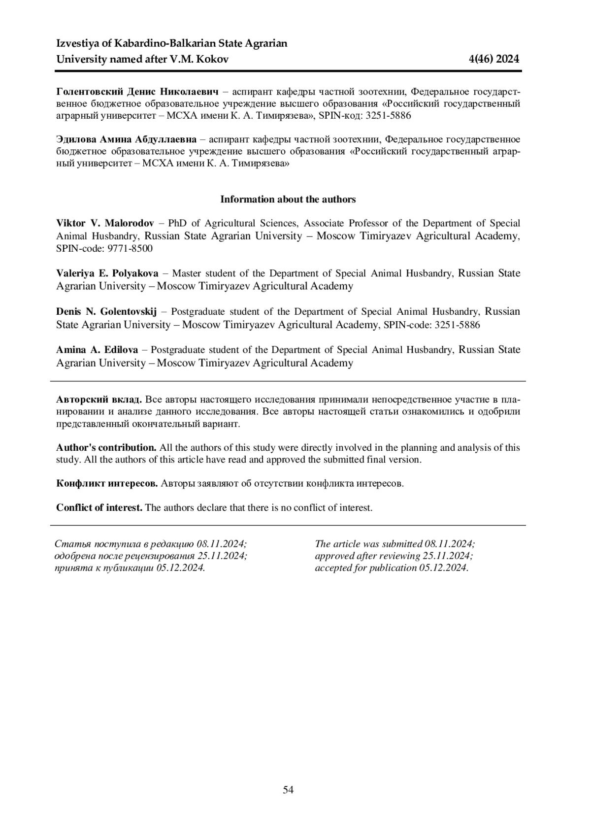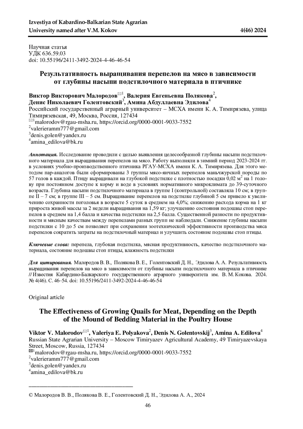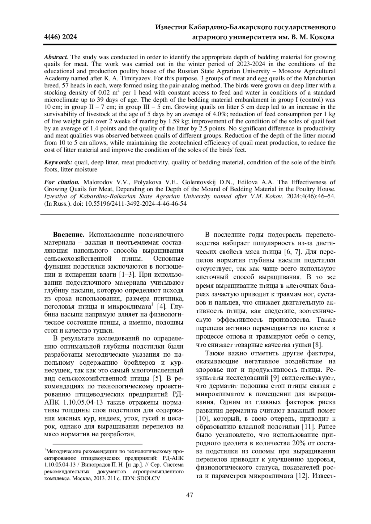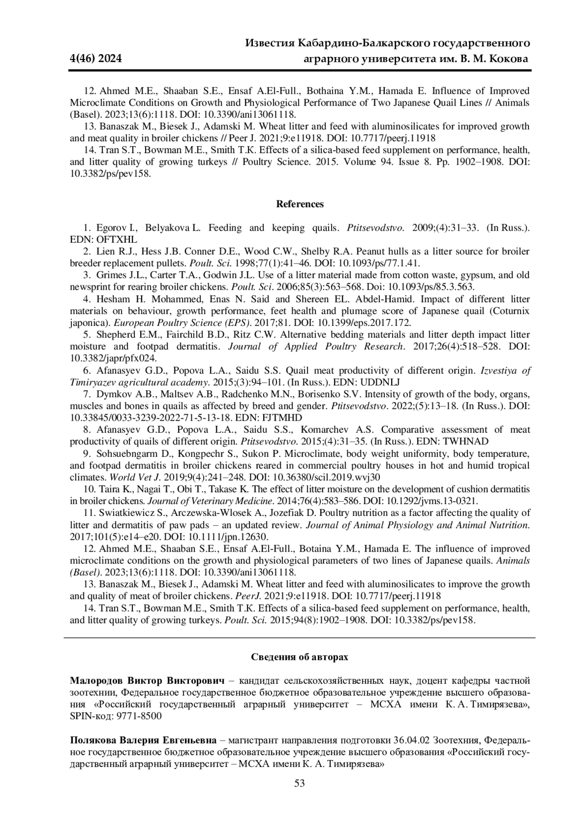12. Ahmed M.E., Shaaban S.E., Ensaf A.El-Full., Bothaina Y.M., Hamada E. Influence of Improved Microclimate Conditions on Growth and Physiological Performance of Two Japanese Quail Lines // Animals (Basel). 2023;13(6):1118. DOI: 10.3390/ani13061118 EDN: ZVSMZS