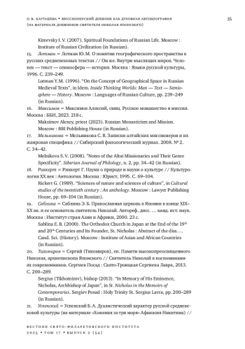 6. Акимова А. С. Дневники русских миссионеров Востока конца XIX - начала XX века: теоретические аспекты // Интернет-журнал СахГУ: “Наука, образование, общество”. 2012. № 1. С. 1-10. URL: http://sakhgu.ru/wp-content/uploads/page/record_36653/2017_09/akimova.pdf (дата обращения: 24.10.2024). EDN: TPKWAX