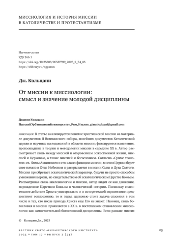 В статье анализируется понятие христианской миссии на материале документов II Ватиканского собора, новейших документов Католической церкви и научных исследований в области миссии; фиксируются изменения, произошедшие в теории и методологии миссии в середине XX в. Автор рассматривает связь между миссией и откровением Божественной жизни, миссией и Церковью, а также миссией и богословием. Согласно «Сумме теологии» св. Фомы Аквинского и его классификации миссии, миссия Церкви берет свое начало в Отце Небесном и раскрывается в миссии Сына и Духа Святого. Миссия приобретает эсхатологический характер, будучи не просто способом умножения церкви, но свидетельством об эсхатологическом Царстве Божьем. Рассматривая связь экклезиологии и миссии, автор видит ее как движение, порожденное Царством Божьим в человеческой истории. Поскольку спасительное действие Христа универсально и в исторической перспективе предшествует воплощению, то и перед церковью стоит задача спасения в том числе и тех, кто после прихода Христа еще Его не знают. Наконец, связь богословия и миссии проявляется в XX в. в постепенном становлении миссиологии как самостоятельной богословской дисциплины. Если раньше миссия рассматривалась в первую очередь как пастырская практика, то в XIX-XX вв. теологи рассматривают понятие «теологии миссии», а миссиология становится самостоятельной богословской дисциплиной. В перспективе автор предполагает переход от теологии миссии к полностью миссионерской теологии.