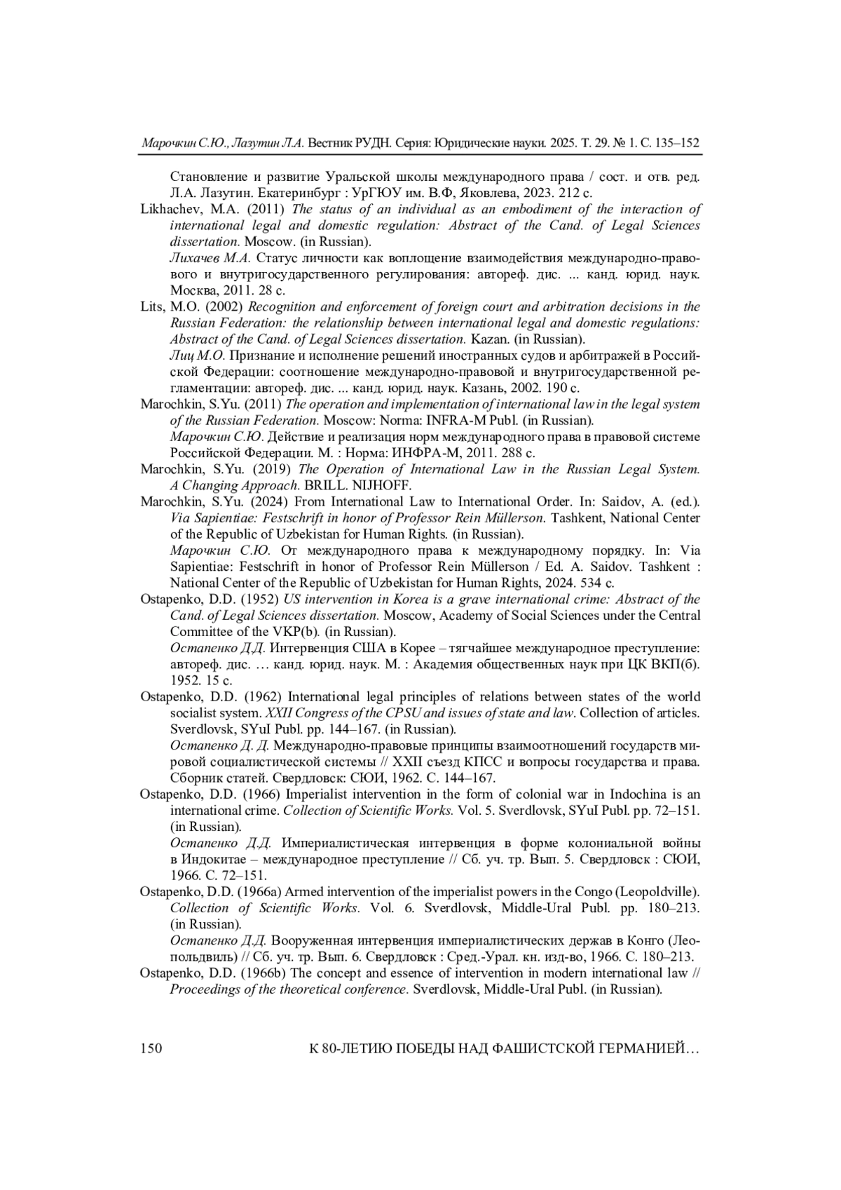 20. Марочкин С.Ю. От международного права к международному порядку. In: Via Sapientiae: Festschrift in honor of Professor Rein Müllerson / Ed. A. Saidov. Tashkent: National Center of the Republic of Uzbekistan for Human Rights, 2024. 534 c.