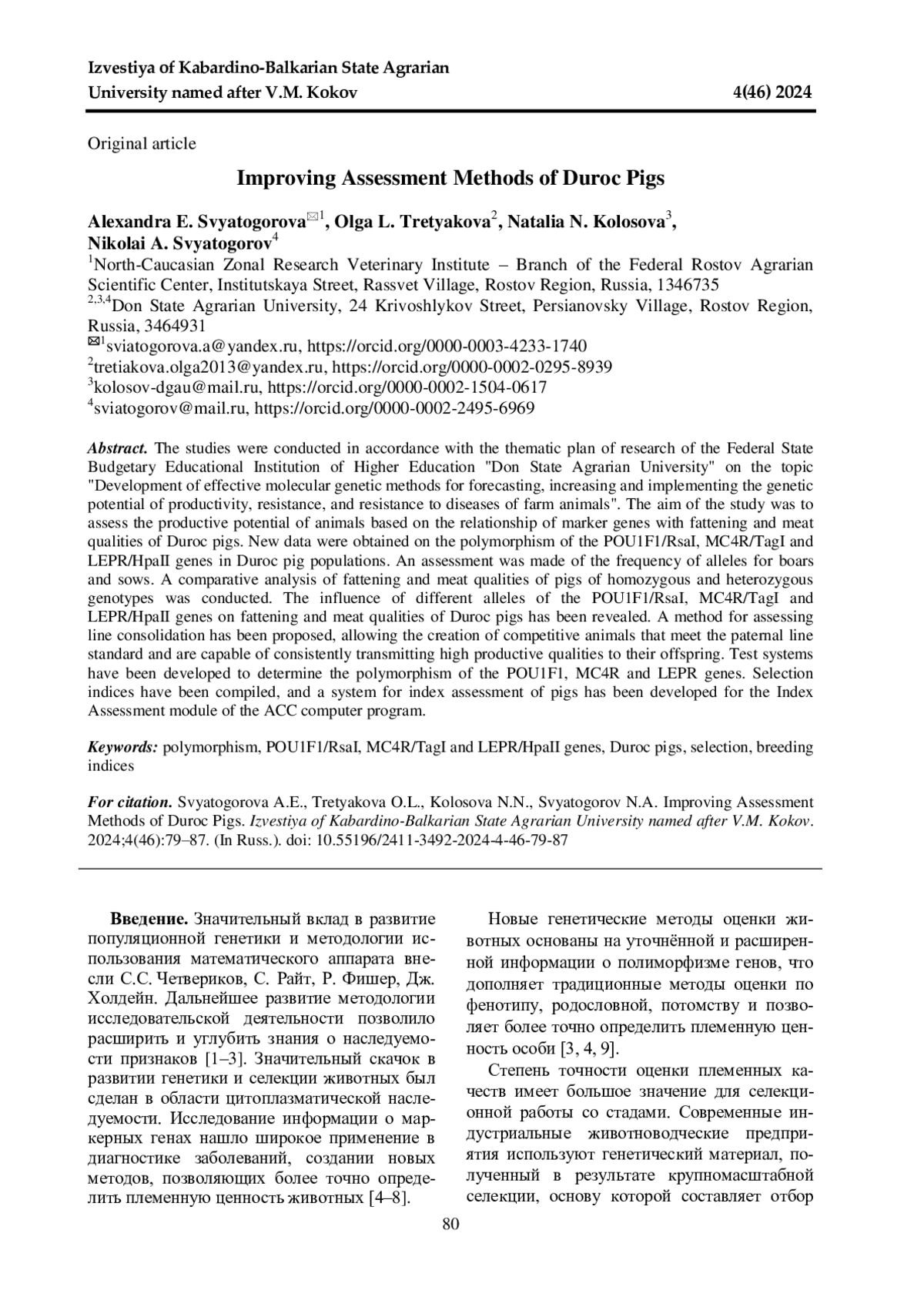 2. 	Третьякова О. Л., Святогорова А. Е., Романцова С. С. Оценка продуктивности свиноматок породы дюрок // Современные наукоемкие технологии производства продукции животноводства: материалы международной научно-практической конференции. Пос. Персиановский. 2022. С. 53-57. EDN: SUZYHV