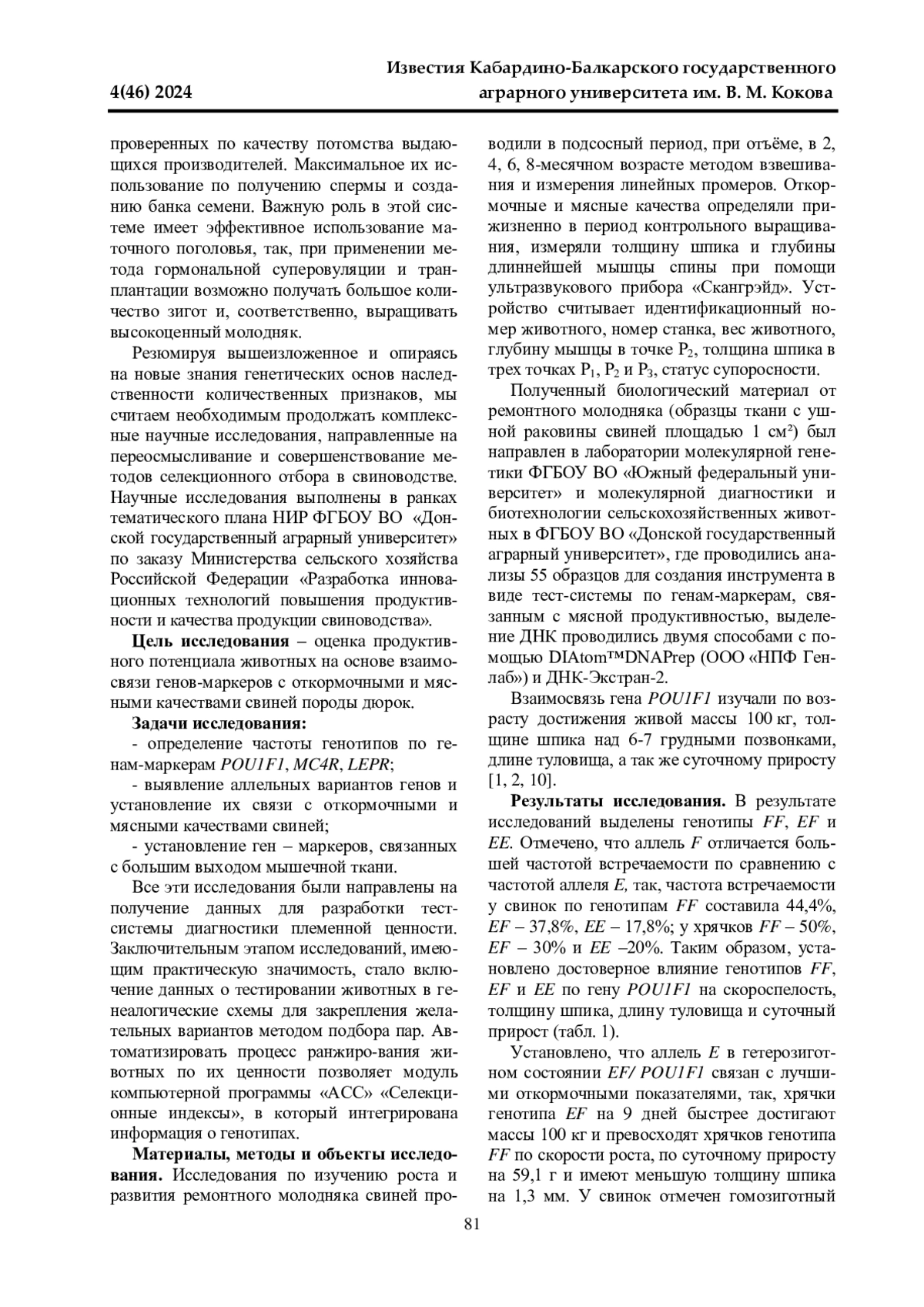 Исследования проводились согласно тематического плана НИР ФГБОУ ВО «Донской государственный аграрный университет» по теме «Разработать эффективные молекулярно-генетические методы прогнозирования, повышения и реализации генетического потенциала продуктивности, резистентности, устойчивости к заболеваниям сельскохозяйственных животных». Цель исследования - проведение оценки продуктивного потенциала животных на основе взаимосвязи генов-маркеров с откормочными и мясными качествами свиней породы дюрок. Получены новые данные о полиморфизме генов POU1F1/RsaI, MC4R/TagI и LEPR/HpaII в популяциях свиней породы дюрок. Дана оценка частоты встречаемости аллелей для хрячков и свинок. Проведен сравнительный анализ откормочных и мясных качеств свиней гомозиготных и гетерозиготных генотипов. Выявлено влияние различных аллелей генов POU1F1/RsaI, MC4R/TagI и LEPR/HpaII на откормочные и мясные качества свиней породы дюрок. Предложен способ оценки консолидации линий, позволяющий создать конкурентно-способных животных, соответствующих стандарту отцовских линий, способных стойко передавать потомству высокие продуктивные качества. Разработаны тест-системы для определения полиморфизма генов POU1F1, МС4R и LEPR. Составлены селекционные индексы, разработана система индексной оценки свиней для модуля «Индексной оценки» компьютерной программы «АСС».