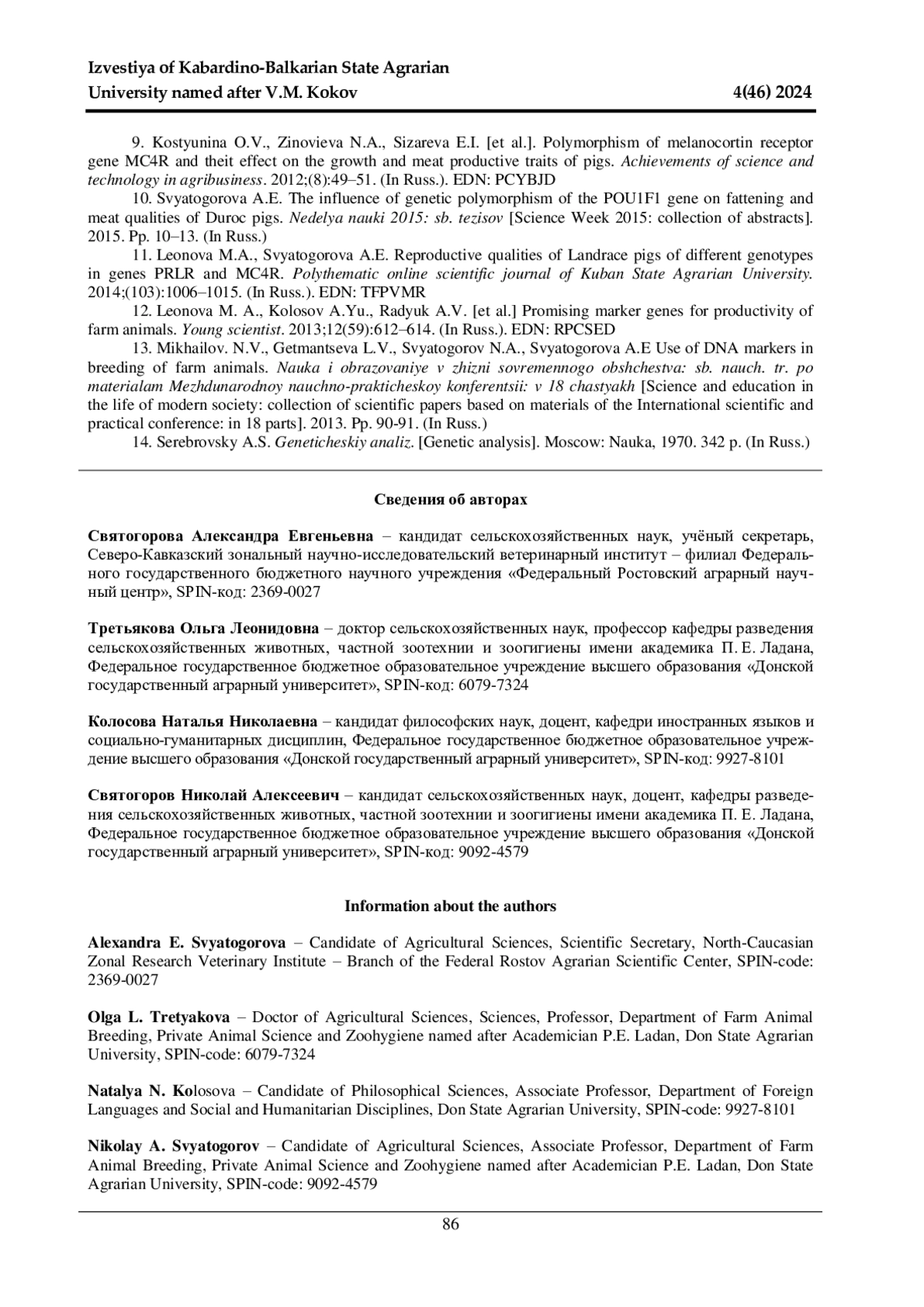 3. 	Mikhailov, N.V., Getmantseva L.V., Usatov A.V., BakoevS.Yu. Assotiations between PRLR/AluI Gene Polymorphism with Reproductive, Growth and Meat Traits in Pigs // Cytology and Genetics. 2014. Vol. 48. № 5. Pр. 323-326. EDN: UFHKXJ