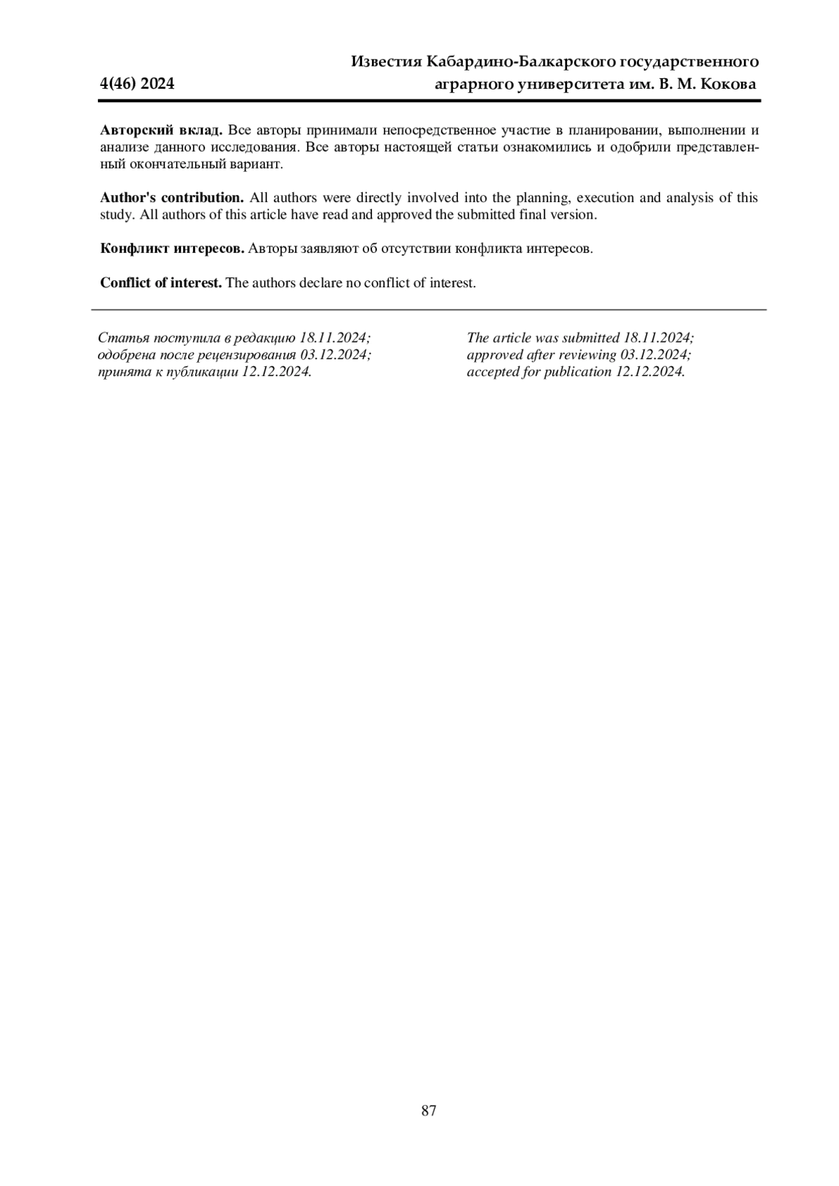 В статье приведены результаты исследований, проведѐнных в 2023-2024 годах на насаждениях голубики высокорослой в ООО «Юг Агро» КБР. Технология культивирования предполагает размещение растений на грядах и искусственное залужение междурядий смесями многолетних трав. В целях снижения конкурентного потенциала сорной растительности, в приствольной полосе применяется контактный гербицид Мегаполис. Ввиду неровности рельефа, отсутствия идеальных погодных условий в период гербицидной обработки, часто возникает снос препарата на культурные растения. Это сопровождается торможением роста, уменьшением площади листовой поверхности и угнетением растений голубики. Цель исследования - изучить влияние некорневого внесения регуляторов роста Фитактив Экстра (0,05%) и Аминозол (0,5%) для уменьшения токсического действия гербицидов, применяемых в приствольных полосах. Испытывались три срока применения: профилактически (за 3 дня до работы десикантом), на следующий день после работы десикантом и комбинированно (и до, и после работы десикантом). В результате исследования доказана достоверная эффективность защитного действия обоих препаратов при некорневом применении их на следующий день после десиканта. В среднем за два года исследований установлено, что в этом случае уменьшение площади листьев, образующихся непосредственно после работы десикантом, составляет 0,6-0,7 см2 (10-12%). При этом такое уменьшение без защиты достигает 40%. Аналогично действие и на другие показатели роста. Профилактическое применение регуляторов роста не оказало существенного защитного действия, а двукратное - не существенно лучше однократного после десиканта, и поэтому не целесообразно.