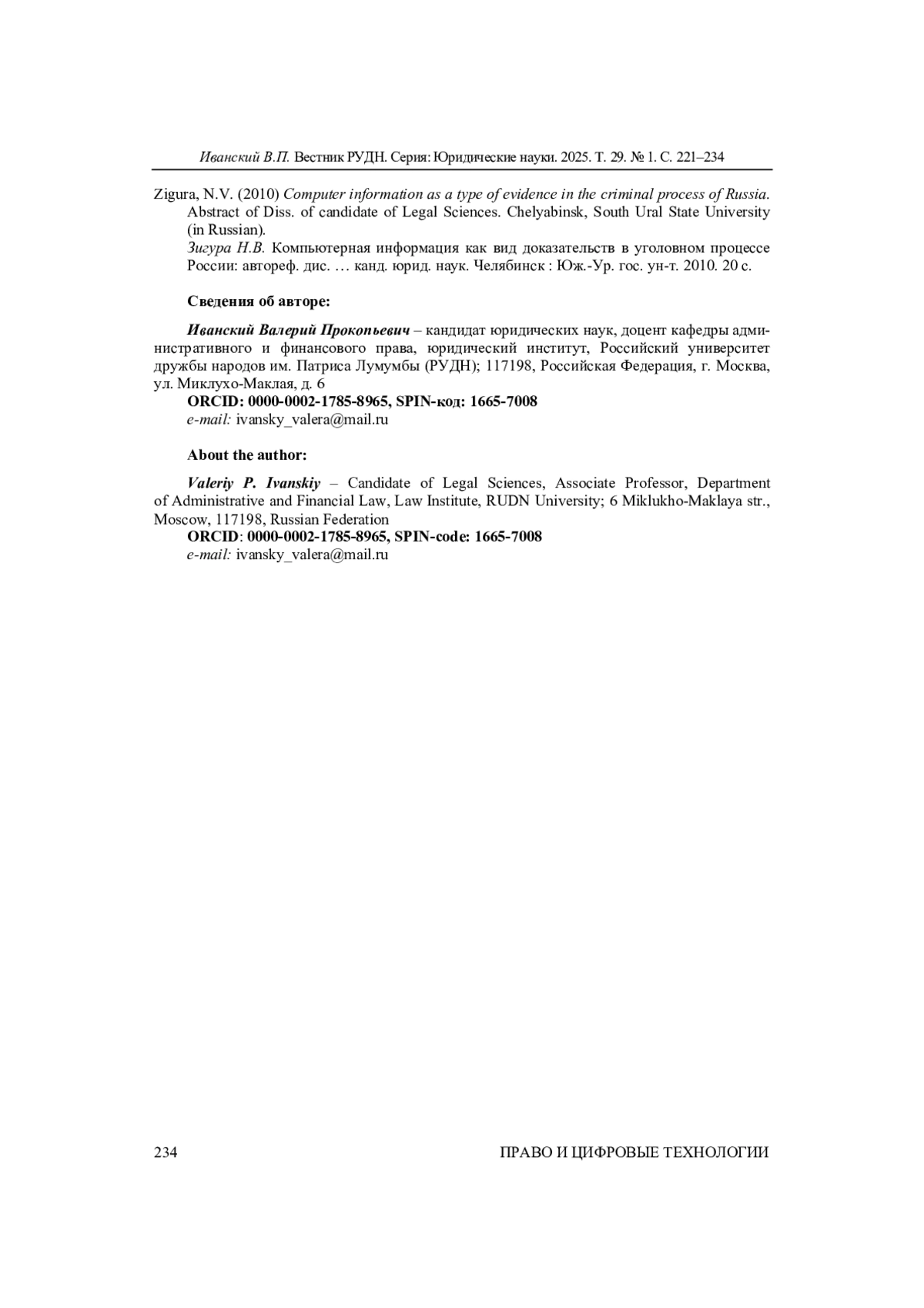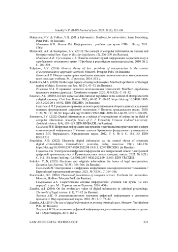 1. 	Баранов А.М. Электронные доказательства: иллюзия уголовного процесса ХХI в. // Уголовная юстиция. 2019. № 13. С. 64-69. DOI: 10.17223/23088451/13/12 EDN: PJCJXL