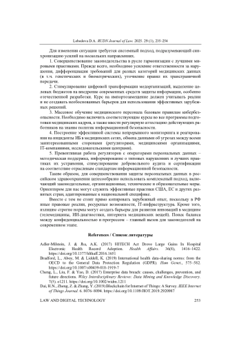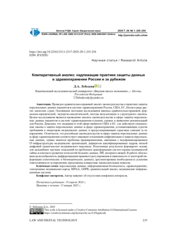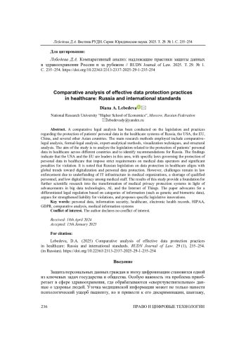 Проведен сравнительно-правовой анализ законодательства и практики защиты персональных данных пациентов в системе здравоохранения России, США, ЕС, Китая и ряда других азиатских стран. Основными методами исследования явились сравнительно-правовой, формально-юридический, экспертно-аналитический, методы визуализации и структурного анализа. Целью исследования является проведение анализа законодательства в сфере защиты персональных данных пациентов в системе здравоохранения в разных странах и выявление рекомендаций для России. Доказано, что лидерами в этой сфере являются США и ЕС, где действуют специальные законы о защите персональных данных в сфере здравоохранения, устанавливающие строгие требования к операторам медицинских данных и предусматривающие серьезные санкции за их нарушение. Отмечается, что российская законодательство в сфере защиты персональных данных в сфере здравоохранения соответствует мировым тенденциям цифровизации и защиты персональных данных, однако имеются проблемы правоприменения, связанные с недофинансированием IT-инфраструктуры медицинских организаций, дефицитом квалифицированных кадров, низкой цифровой грамотностью медицинского персонала. Полученные результаты формируют основу для дальнейших научных изысканий по проблемам трансформации систем охраны медицинской тайны в контексте развития технологий больших данных, ИИ, интернета вещей. В работе обоснована целесообразность дифференциации правового регулирования в зависимости от категорий информации (генетических и биометрических данных), аргументирована необходимость усиления ответственности за нарушения, предложены конкретные законодательные новеллы.