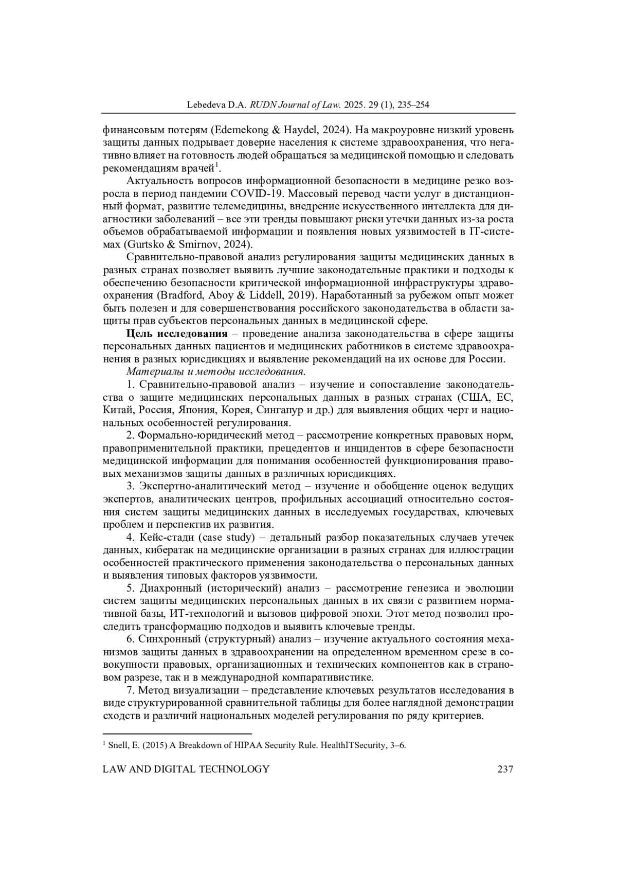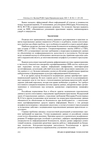 Защита персональных данных граждан в эпоху цифровизации становится одной из ключевых задач государства и общества. Особую важность эта проблема приобретает в сфере здравоохранения, где обрабатываются «сверхчувствительные» данные о здоровье людей. Утечка медицинской информации может не только нанести психологический ущерб пациенту, но и привести к его дискриминации, шантажу, финансовым потерям (Edemekong & Haydel, 2024).