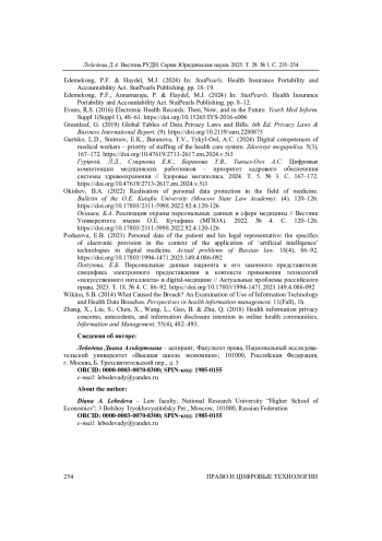 11. 	Подузова, Е.Б. Персональные данные пациента и его законного представителя: специфика электронного предоставления в контексте применения технологий “искусственного интеллекта” в digital-медицине // Актуальные проблемы российского права. 2023. Т. 18. № 4. C. 86-92. DOI: 10.17803/1994-1471.2023.149.4.086-092 EDN: FFJYNU