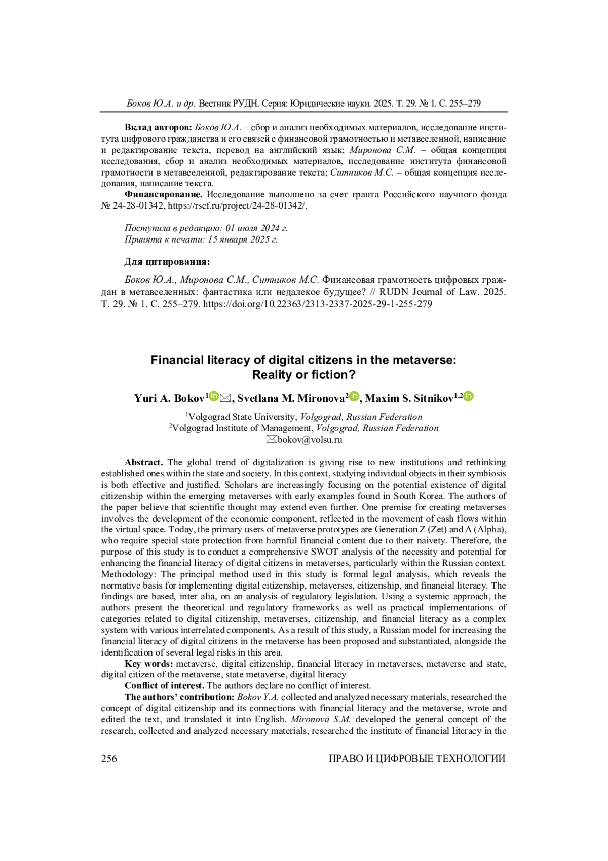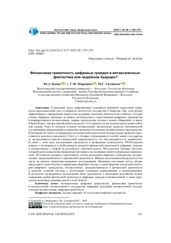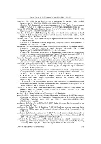 40. Sitnikov, M.S. (2024a) Financial and Legal Development of Social Relations Using Digital Currencies in Metaverses. Journal of Digital Technologies and Law. 2(1), 200-220. 10.21202/jdtl.2024.11. (in Russia). DOI: 10.21202/jdtl.2024.11.(inRussia) EDN: YXCJNO