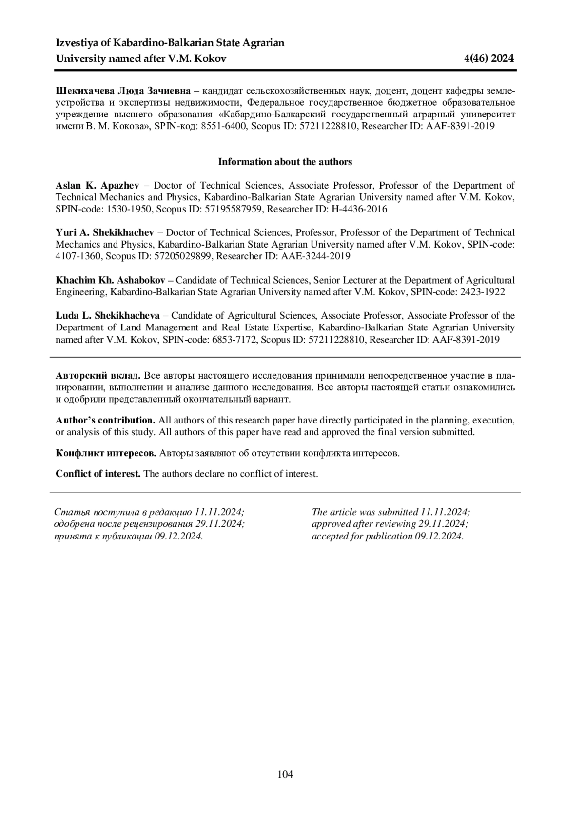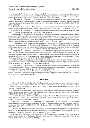 6. 	Балкаров Р. А., Чеченов М. М., Сабанчиева Ф. Р. Конструктивно-технологические факторы экономии топливно-смазочных материалов // Известия Кабардино-Балкарского государственного аграрного университета им. В. М. Кокова. 2020. № 2(28). С. 111-116. EDN: ITNEIQ