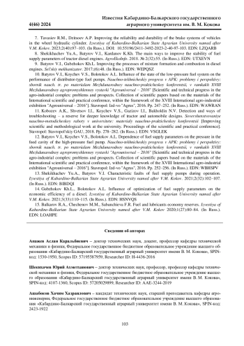 14. 	Губжоков Х. Л., Болотоков А. Л. Влияние оптимизации параметров топливоподачи на экономическую эффективность дизеля // Известия Кабардино-Балкарского государственного аграрного университета им. В. М. Кокова. 2021. № 3(33). С. 110-115. EDN: HSNVQS