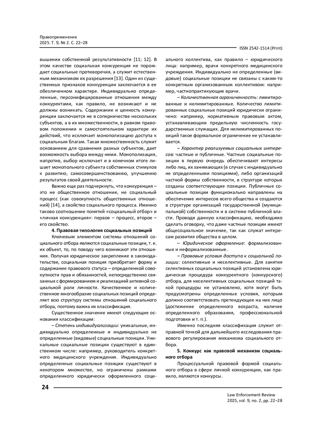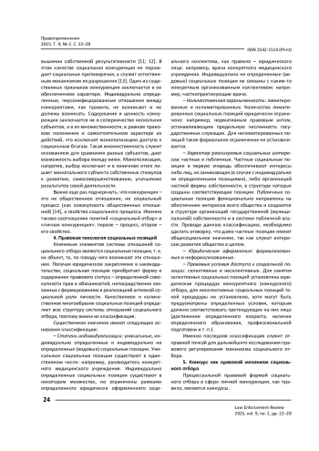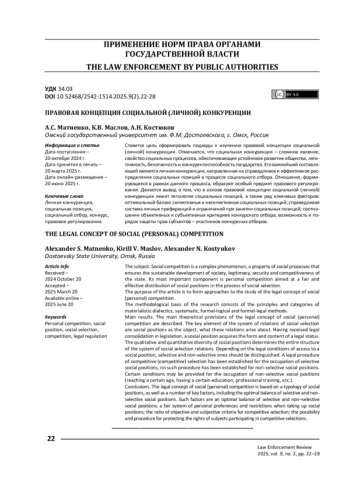 Ставится цель сформировать подходы к изучению правовой концепции социальной (личной) конкуренции. Отмечается, что социальная конкуренция – сложное явление, свойство социальных процессов, обеспечивающее устойчивое развитие общества, легитимность, безопасность и конкурентоспособность государства. Его важнейшей составляющей является личная конкуренция, направленная на справедливое и эффективное распределение социальных позиций в процессе социального отбора. Отношения, формирующиеся в рамках данного процесса, образуют особый предмет правового регулирования. Делается вывод о том, что в основе правовой концепции социальной (личной) конкуренции лежит типология социальных позиций, а также ряд ключевых факторов: оптимальный баланс селективных и неселективных социальных позиций; справедливая система личных преференций и ограничений при занятии социальных позиций; соотношение объективных и субъективных критериев конкурсного отбора; возможность и порядок защиты прав субъектов – участников конкурсных отборов.