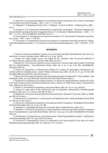 13. Бутаков А. В. От социального противоречия к социальной конкуренции - базовому правовому режиму (способу) жизнедеятельности государства (Часть I) / А. В. Бутаков // Правоприменение. - 2023. - Т. 7, № 2. - С. 5-15. - https://doi.org/10.52468/2542-1514.2023.7(2).5-15.