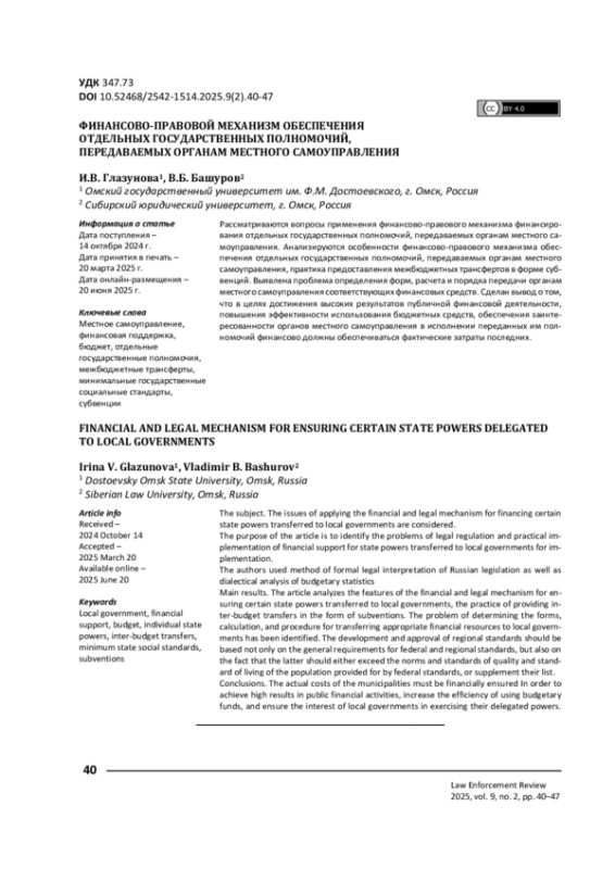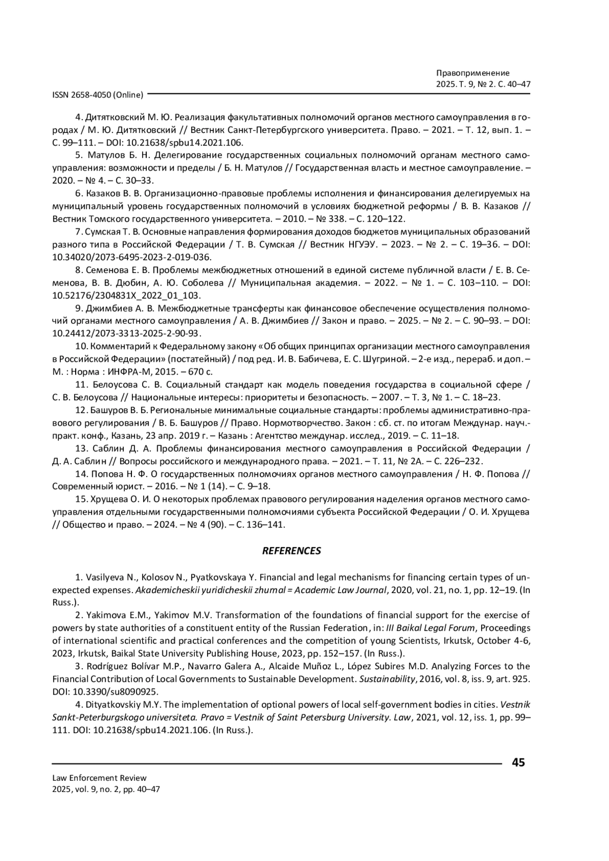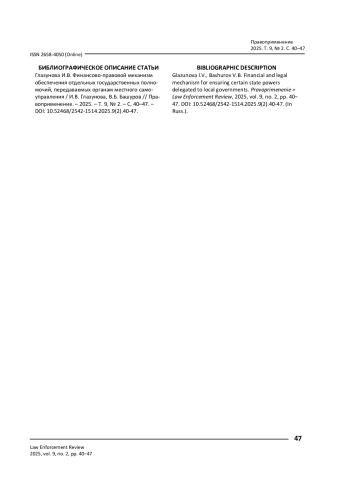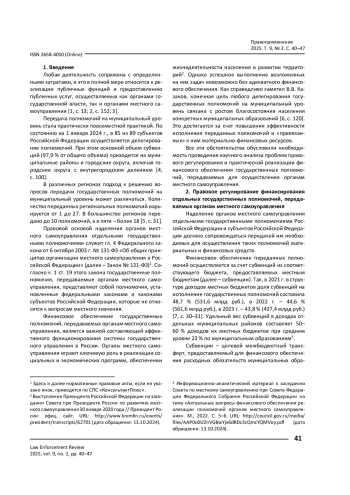 9. Джимбиев А. В. Межбюджетные трансферты как финансовое обеспечение осуществления полномочий органами местного самоуправления / А. В. Джимбиев // Закон и право. - 2025. - № 2. - С. 90-93. - https://doi.org/10.24412/2073-3313-2025-2-90-93.