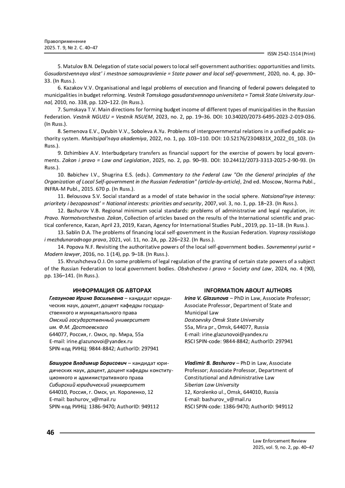 5. Матулов Б. Н. Делегирование государственных социальных полномочий органам местного самоуправления: возможности и пределы / Б. Н. Матулов // Государственная власть и местное самоуправление. - 2020. - № 4. - С. 30-33.