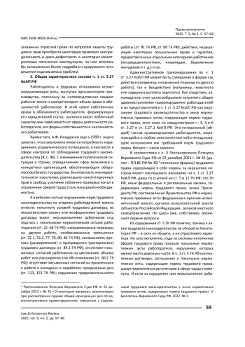 Рассматриваются отдельные проблемные вопросы привлечения к административной ответственности в рамках общего состава правонарушения по ст. 5.27 Кодекса РФ об административных правонарушениях. Отмечается, что предмет отрасли трудового права очень подвижен, он уже частично затрагивает и вопросы занятости, и сферу образования, и отдельные аспекты обеспечения национальной безопасности. Следовательно, применение административной ответственности за нарушение указанных норм необходимо организовывать через очень детальное толкование ее распространения на сложные случаи межотраслевого регулирования, затрагивающего сферу труда или отдельные аспекты ее функционирования.