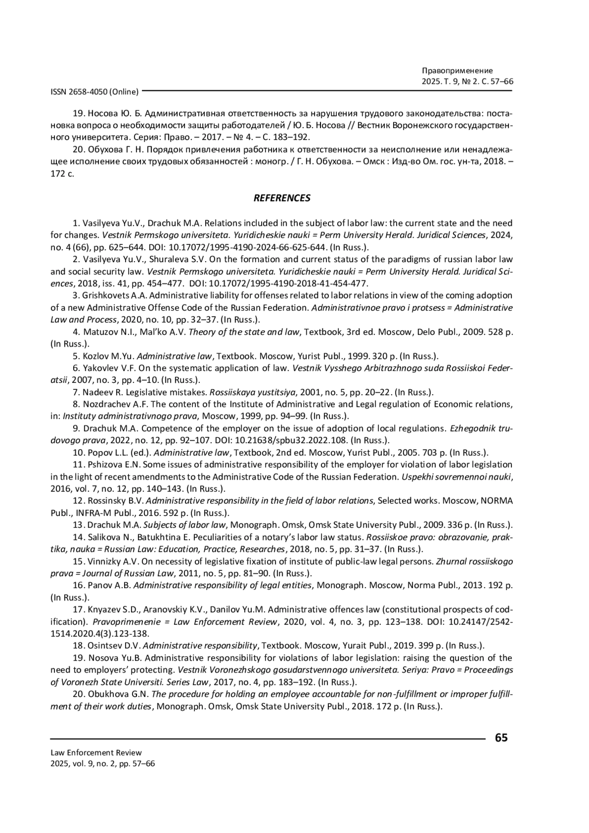 19. Носова Ю. Б. Административная ответственность за нарушения трудового законодательства: постановка вопроса о необходимости защиты работодателей / Ю. Б. Носова // Вестник Воронежского государственного университета. Серия: Право. - 2017. - № 4. - С. 183-192.
