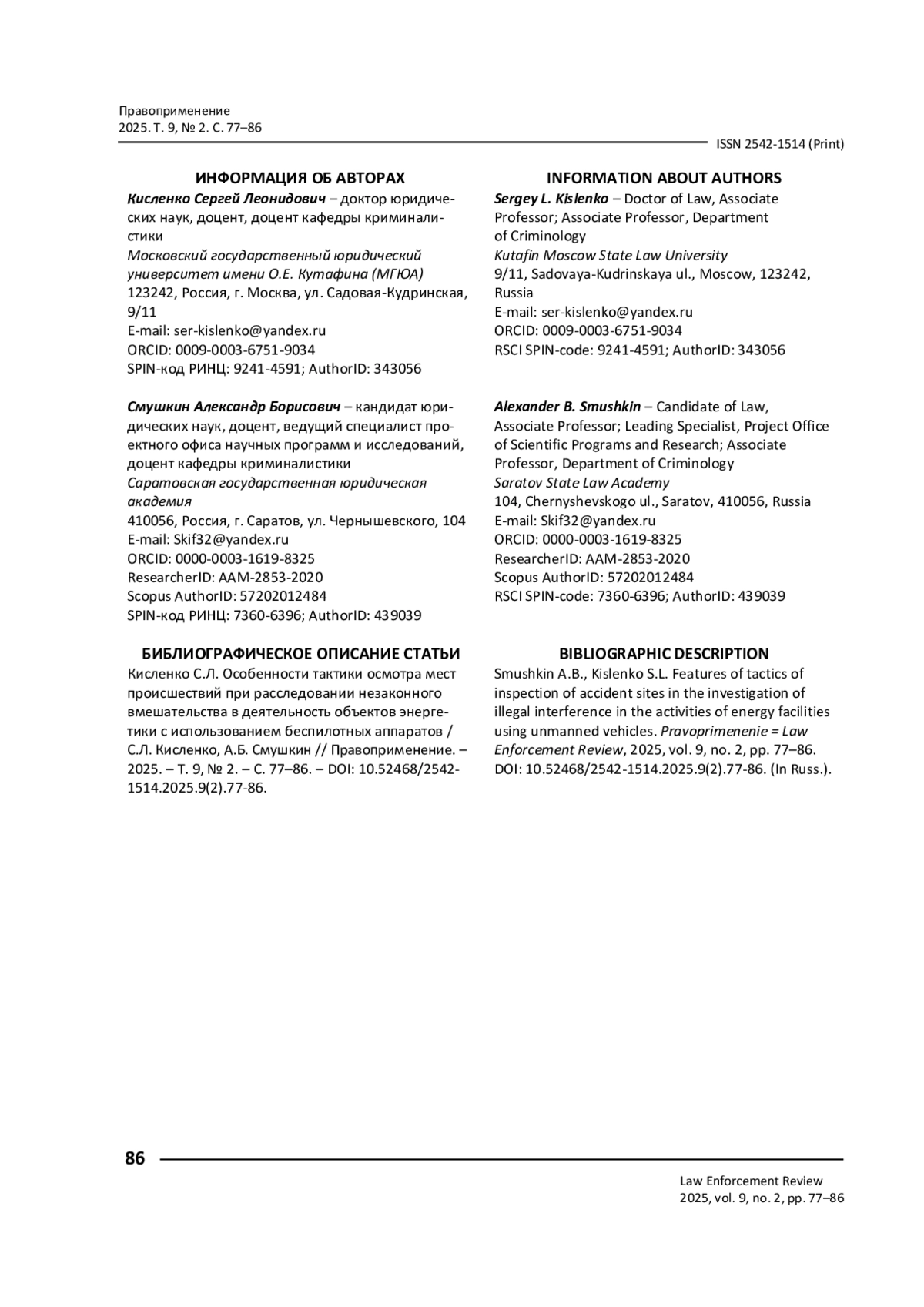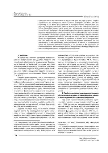 Энергетические системы всех стран мира в условиях вооруженных конфликтов всё чаще подвергаются внешним физическим атакам, в том числе с использованием передовых технологий (например, беспилотных аппаратов). Поскольку от функционирования таких систем зависит национальная безопасность страны, актуализируются вопросы своевременного пресечения подобных атак и выявления лиц, их осуществивших. Передовая роль в данном процессе отводится криминалистическим средствам, приемам и методам расследования данных криминальных событий. В статье выделяются проблемные аспекты, связанные с характеристиками объектов энергетического комплекса, технологиями их функционирования, типами беспилотных аппаратов и их конструктивными особенностями, а также современными техническими и кадровыми возможностями правоохранительных органов по обеспечению процесса обнаружения, фиксации и изъятия следовой информации.