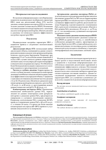 Основные результаты включают улучшение газообмена, предотвращение коллапса альвеол с помощью PEEP и эффективную оксигенацию при минимальных уровнях FiO₂. Исследование подчеркивает важность персонализированных настроек ИВЛ и применения современных технологий мониторинга для улучшения результатов лечения критически больных пациентов.