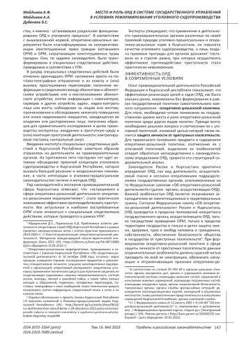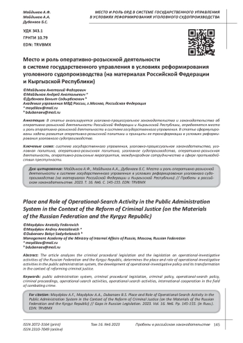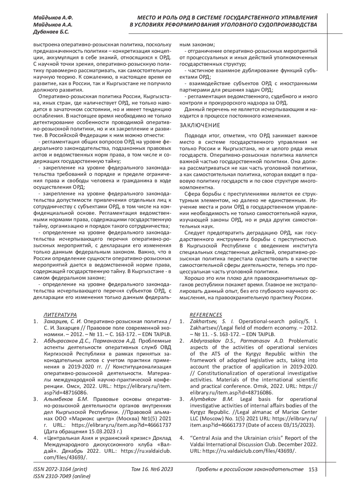 Abdyrasakov D.S., Parmanasov A.D. Problematic aspects of the activities of operational services of the ATS of the Kyrgyz Republic within the framework of adopted legislative acts, taking into account the practice of application in 2019-2020. // Constitutionalization of operational investigative activities. Materials of the international scientific and practical conference. Omsk, 2022. URL: https://elibrary.ru/item.asp?id=48716086.