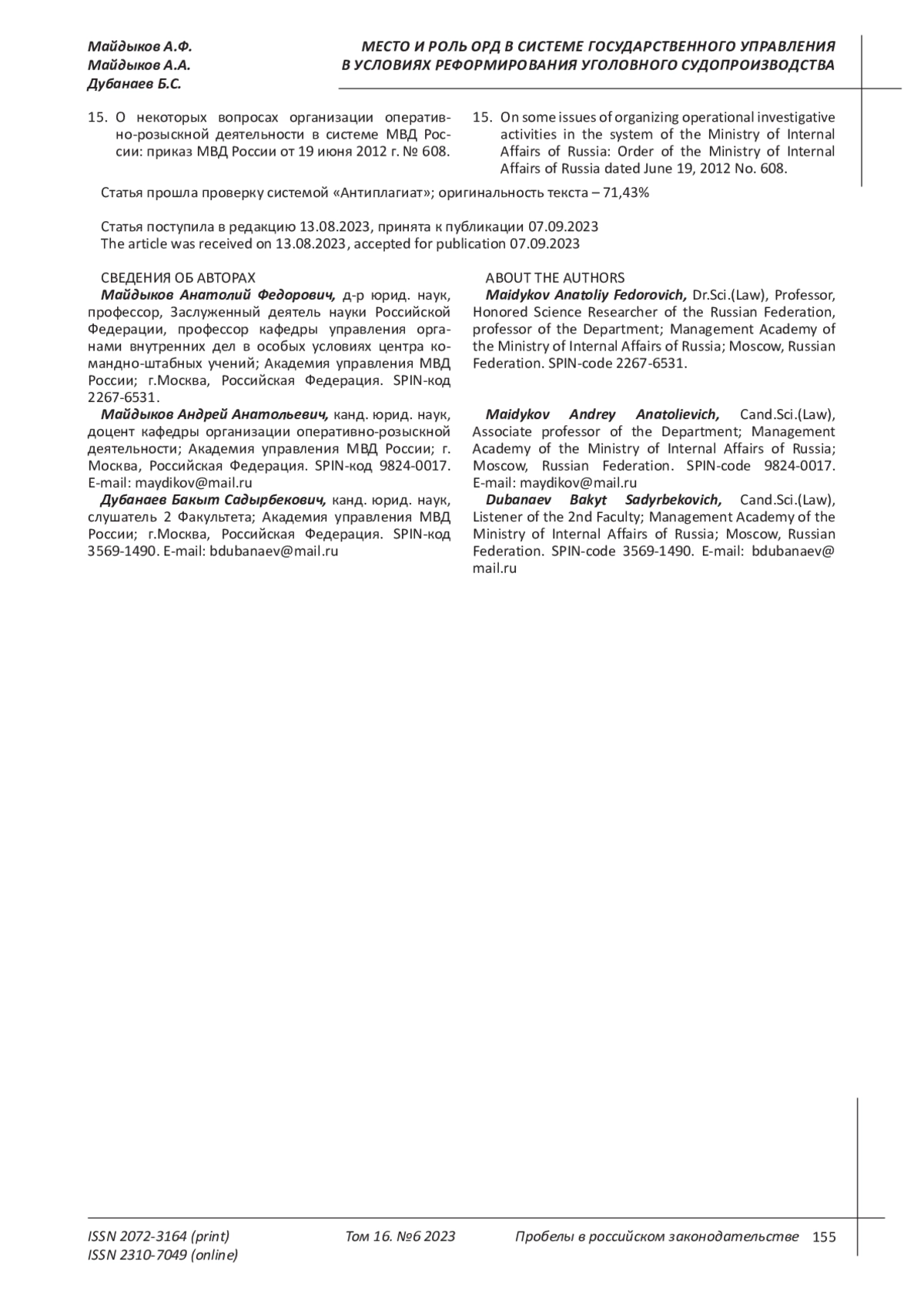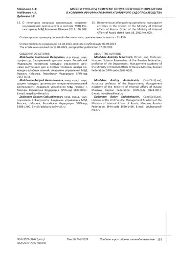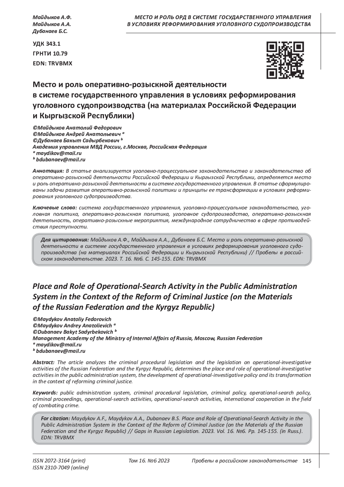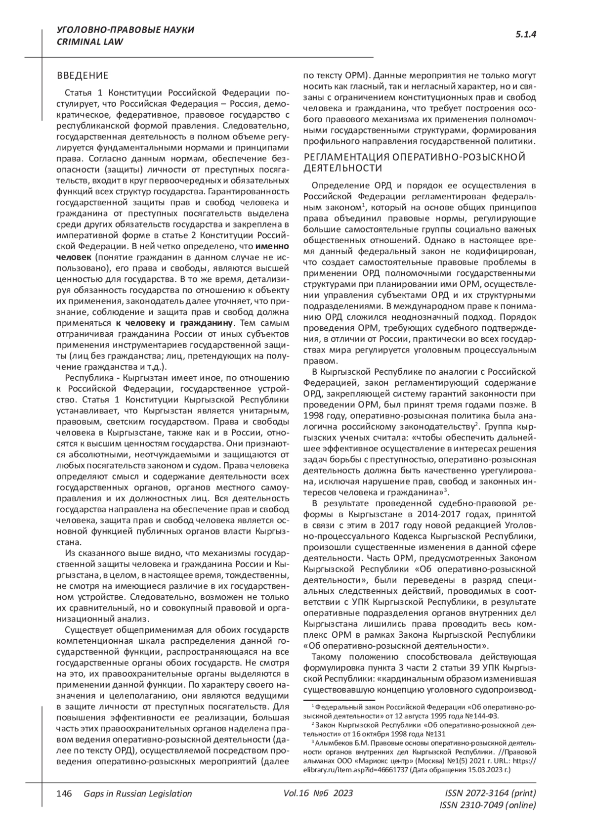 Alymbekov B.M. Legal basis for operational investigative activities of internal affairs bodies of the Kyrgyz Republic. //Legal almanac of Mariox Center LLC (Moscow) No. 1(5) 2021 URL: https://elibrary.ru/item.asp?id=46661737 (Date of access 03/15/2023).
