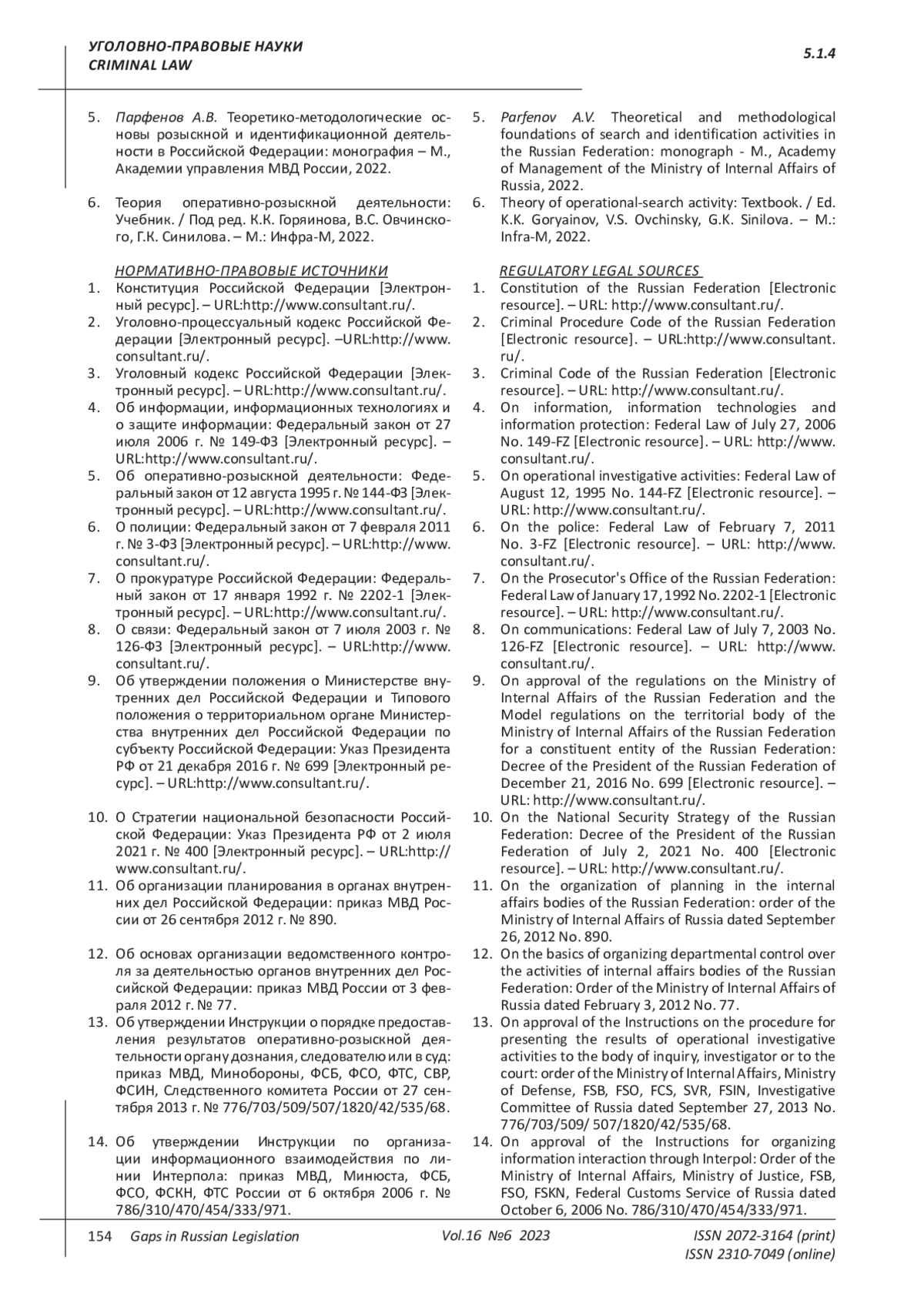 5. 	Парфенов А.В. Теоретико-методологические основы розыскной и идентификационной деятельности в Российской Федерации: монография - М., Академии управления МВД России, 2022. EDN: UJIXKR