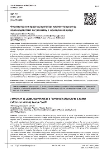 Экстремизм является серьезной угрозой для общественной безопасности и стабильности государств. Сущность экстремизма заключается в радикальной идеологии, насилии и стремлении к изменению существующего порядка. Опасность, которую представляют собой радикально настроенные индивиды и группы, требует проведения на постоянной основе комплекса превентивных мер противодействия экстремизму. В статье обосновывается, что профилактика экстремизма занимает важное место в системе противодействия преступности, поскольку рассматриваемое социальное негативное явление современной действительности выступает основной причиной социальной деструктивности и «поражает» широкие слои населения. Отмечается, что наиболее подвержена влиянию экстремистской идеологии современная молодежь, что обуславливает необходимость формирования у данной группы населения антиэкстремистского мировоззрения, способствующего снижению влияния экстремистской идеологии и взглядов. Автором делается вывод о том, что для борьбы с экстремизмом в молодежной среде требуется комплексный подход, включающий превентивные меры, в том числе антиэкстремистское просвещение, образование и воспитание, а также правовые меры, международное сотрудничество и социальную интеграцию. Превентивные меры направлены на предотвращение радикализации и формирование толерантного общества, а правовое регулирование и сотрудничество, в том числе на международном уровне, способствуют пресечению экстремистских действий и преследованию сторонников экстремистских взглядов и идей.