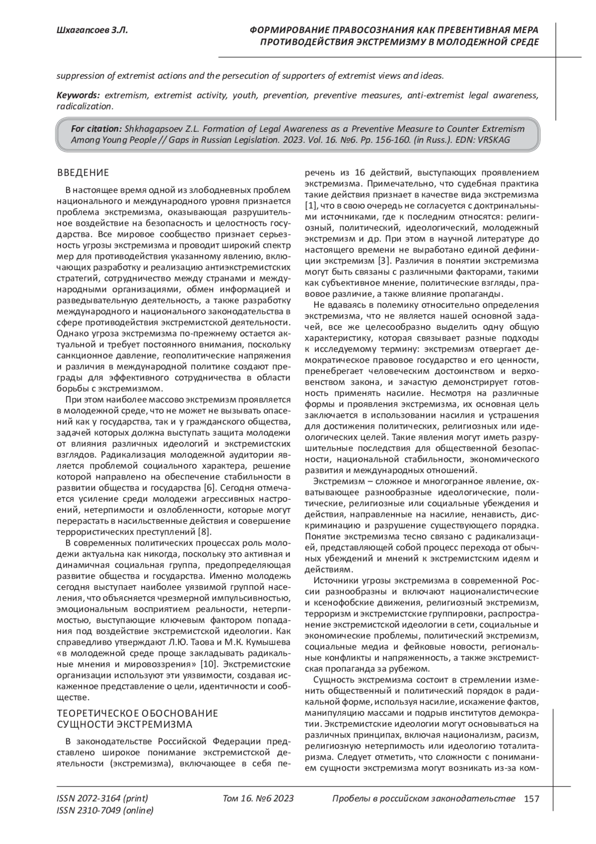 Krymshokalov A.Z., Thagalegov A.A. Issues of preventing radicalism and extremism among youth // Eurasian Legal Journal. 2021. No. 10 (161).