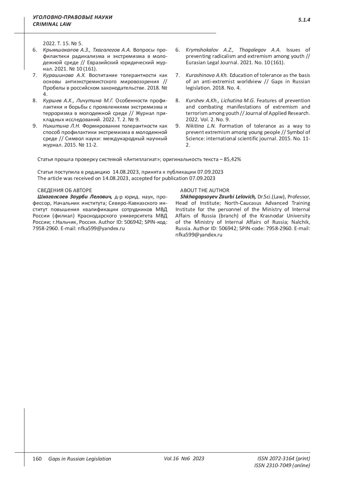 6. Крымшокалов А.З., Тхагалегов А.А. Вопросы профилактики радикализма и экстремизма в молодежной среде // Евразийский юридический журнал. 2021. № 10 (161). EDN: WRIPIJ