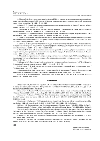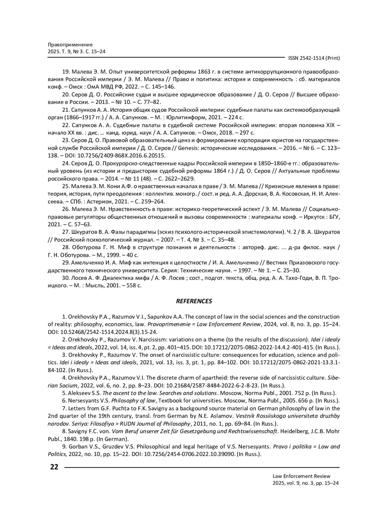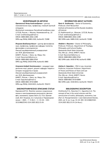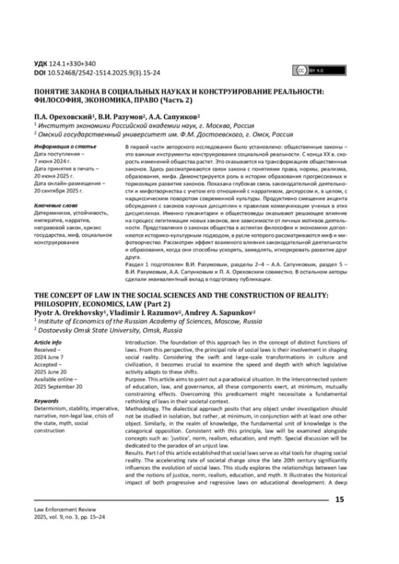 1. Ореховский П. А. Понятие закона в социальных науках и конструирование реальности: философия, экономика, право / П. А. Ореховский, В. И. Разумов, А. А. Сапунков // Правоприменение. - 2024. - Т. 8, № 3. - С. 15-24. - https://doi.org/10.52468/2542-1514.2024.8(3).15-24.