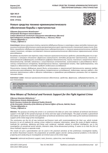 Целью написания статьи является обобщение данных о некоторых новых методах технико-криминалистического обеспечения в свете распространения групп преступлений и технологий нового типа. В работе приводится обобщенная характеристика кибепреступности и технико-криминалистических средств нового поколения, которые составляют технико-криминалистическое обеспечение первоначального этапа расследования. Выводами выступает сам перечень новых технико-криминалистических средств с рекомендациями по их применению к которым относятся: форензика (совокупность методов раскрытия преступлений, связанных с компьютерной информацией, исследования цифровых доказательств, поиска, получения и закрепления таких доказательств), методы связанные с искусственным интеллектом, использование в расследовании беспилотных летательных аппаратов, биометрических данных, трехмерной печати. Нам представляется, что первый из обозначенных методов требует отдельного исследования. Результаты такого обобщения могут быть использованы в практической деятельности органов предварительного расследования, для дальнейших теоретических исследований, подготовки научных работ и для решения практических задач в области подготовки и проведения расследования уголовных дел на первоначальном этапе.