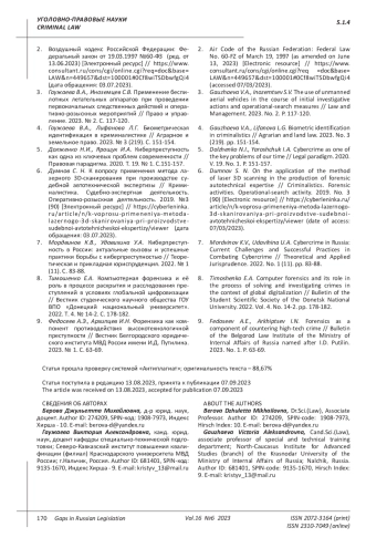 8. 	Тимошенко Е.А. Компьютерная форензика и её роль в процессе раскрытия и расследования преступлений в условиях глобальной цифровизации // Вестник студенческого научного общества ГОУ ВПО “Донецкий национальный университет”. 2022. Т. 4. № 14-2. С. 178-182. EDN: KRSFKN