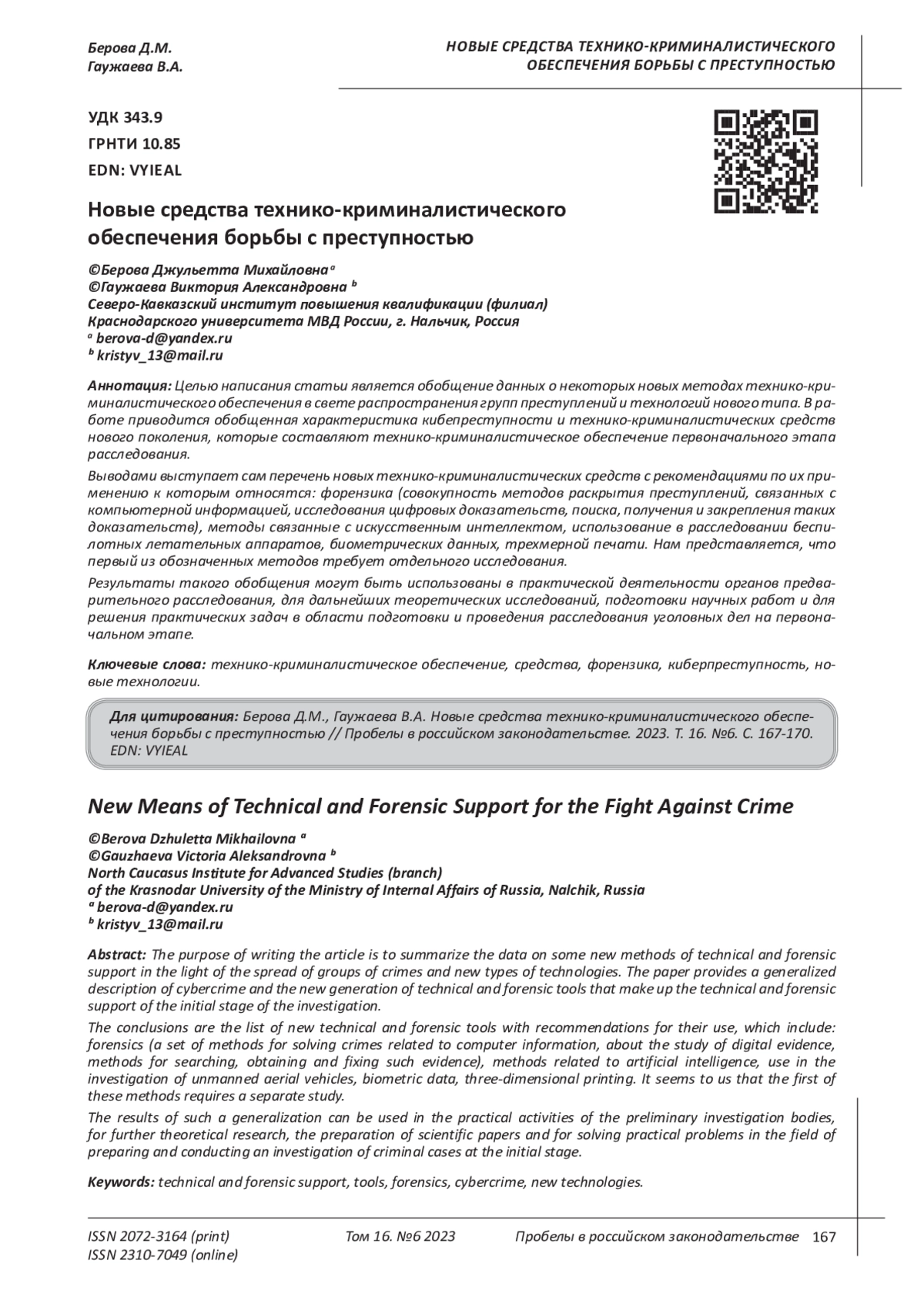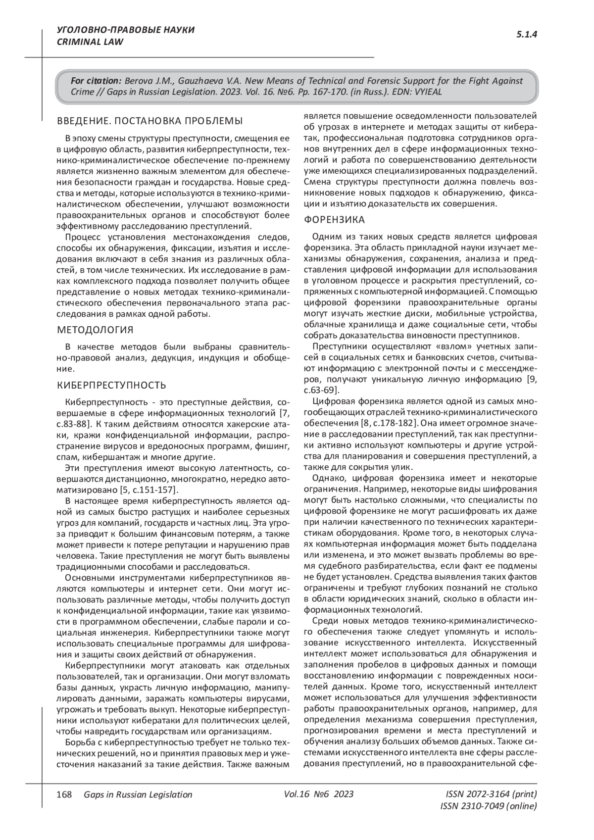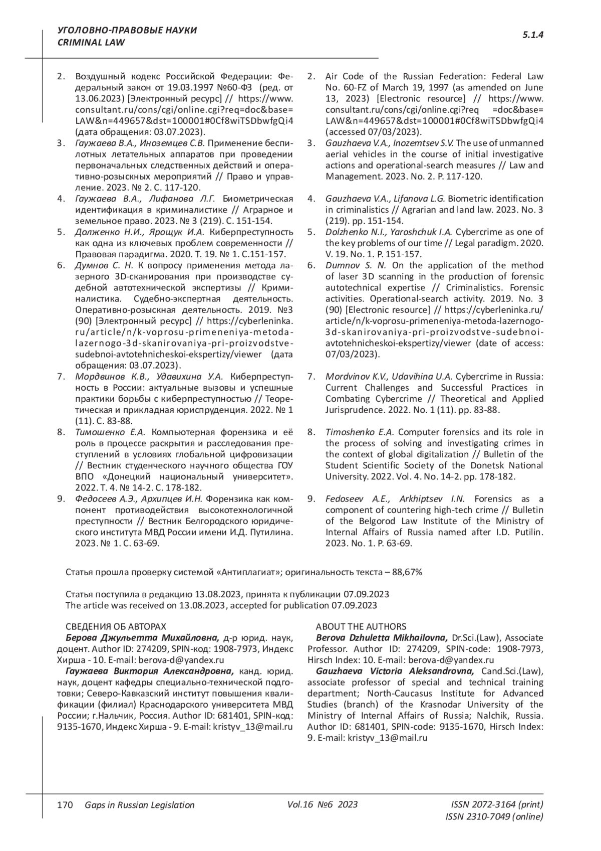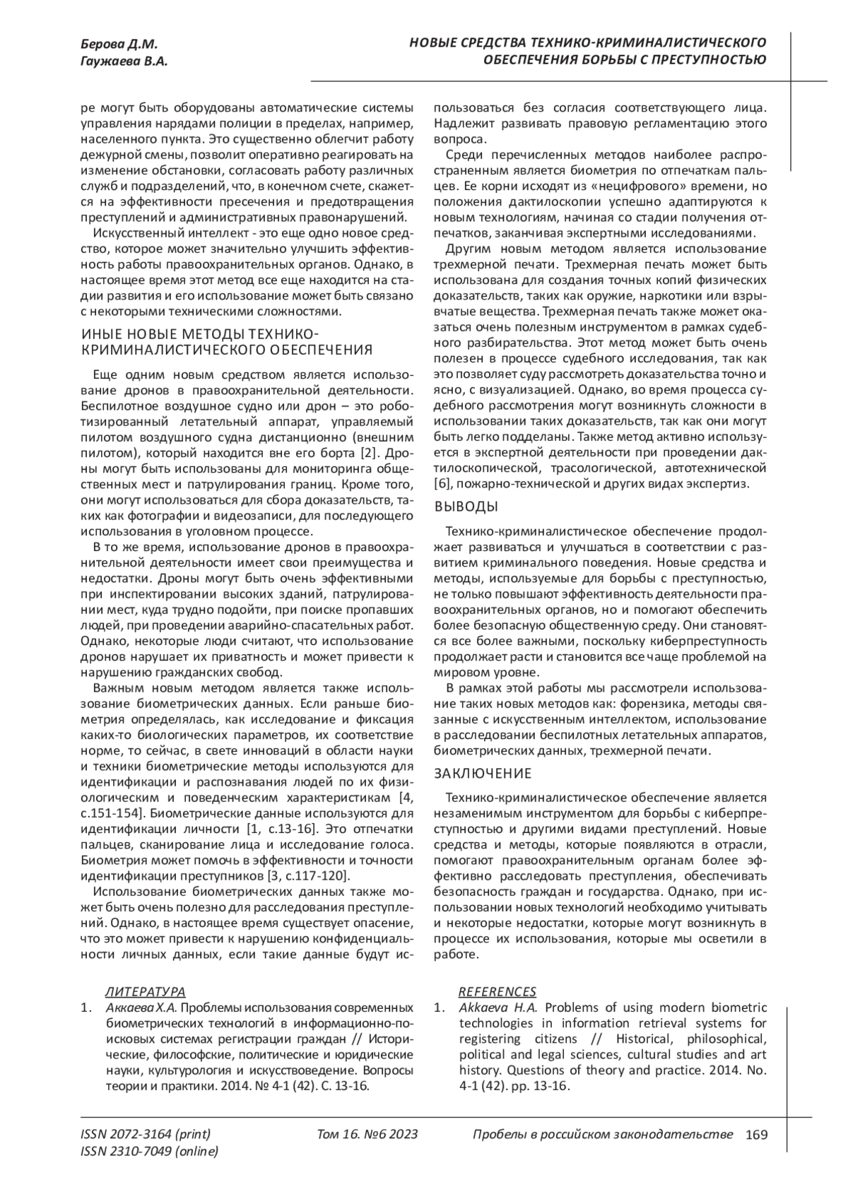 4. 	Гаужаева В.А., Лифанова Л.Г. Биометрическая идентификация в криминалистике // Аграрное и земельное право. 2023. № 3 (219). С. 151-154. EDN: XHLUNY