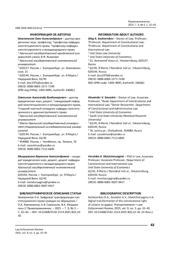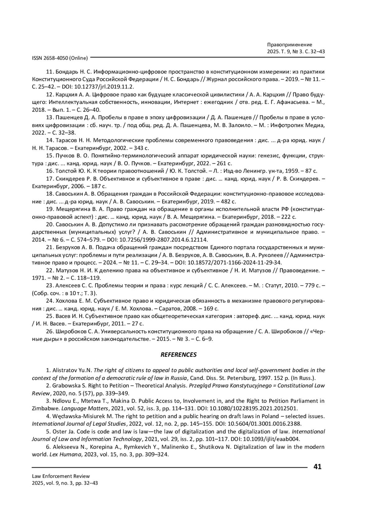 Цифровая трансформация конституционного права на обращение началась с либерального подхода (были установлены упрощенные требования к обращениям в электронной форме) и до 2025 г. характеризовалась увеличением числа электронных каналов подачи обращений граждан. Однако с 30 марта 2025 г. тенденция сменилась. Были упорядочены электронные способы подачи обращений, а их отправка была обусловлена идентификацией и (или) аутентификацией заявителей. В статье анализируются следующие этапы трансформации конституционного права на обращение: легализация обращений в электронной форме, появление специализированных государственных порталов для подачи обращений, появление исключительно электронных форм обращений граждан, использование Единого портала государственных и муниципальных услуг для подачи обращений, а также новеллы конца 2024 г., упорядочившие способы подачи электронных обращений.