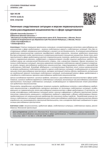 Статья посвящена практически значимым и основополагающим аспектам в расследовании мошенничества в сфере кредитования - анализу следственных версий и следственных ситуаций. Эти два составляющих задают направление расследования и влияют на его динамичность. В ситуациях расследования кредитного мошенничества сказанное приобретает особую важность, поскольку кредитные мошенники быстро устраняют следы преступления и оперативно реализуют похищенное имущество. Более того, рост преступлений в сфере кредитования растет стремительными темпами, кредитные мошенники адаптируются к современным реалиям, изобретают и совершенствуют способы хищения кредитных средств, что создает угрозу как экономической безопасности страны, так и развитию торговли. Верное понимание типичных следственных ситуаций, логически грамотное построение следственных версий позволит оперативно начать процесс расследования кредитного мошенничества, структурированно подойти к производству следственных действий. Благодаря обобщению и систематизации богатого опыт ученых-криминалистов по вопросу выдвижения следственных версий и оценке следственных ситуаций, складывающихся на первоначальном этапе расследования преступления, авторам настоящей статьи удалось предложить актуальную на сегодняшний момент типизацию следственных ситуаций, учитывающей реалии сферы кредитования и способности следственных органов в расследовании кредитного мошенничества. Целью исследования является: изучение проблем, связанных с расследованием мошенничества в сфере кредитования, изучение наиболее вероятных следственных ситуаций, возникающих при расследовании указанного преступления; типизация следственных ситуаций, складывающихся на первоначальном этапе расследования кредитного мошенничества. Результаты проведенного исследования позволили выявить проблемные аспекты в расследовании кредитного мошенничества и разработать авторские критерии по типизации следственных ситуаций, складывающихся на первоначальном этапе расследования мошенничества в сфере кредитования. В частности, за основу классификации следственных ситуаций взято: наличие информации о субъекте преступного посягательства; совокупность имеющихся у следователя сведений о характере и объеме недостоверных данных, предоставленных от злоумышленника кредитору для получения ссудных средств. Посредством анализа типичных следственных ситуаций первоначального этапа расследования кредитного мошенничества удалось определить как закономерности преступной деятельности, так и алгоритм действий следователя по организации расследования преступления.