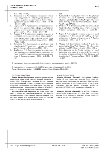 7. Тагиров Р. А. Следственные версии по делам о расследовании мошенничества в сфере кредитования юридических лиц и индивидуальных предпринимателей // Российский следователь. - 2021. - № 9. - С. 27. EDN: XBMMEB