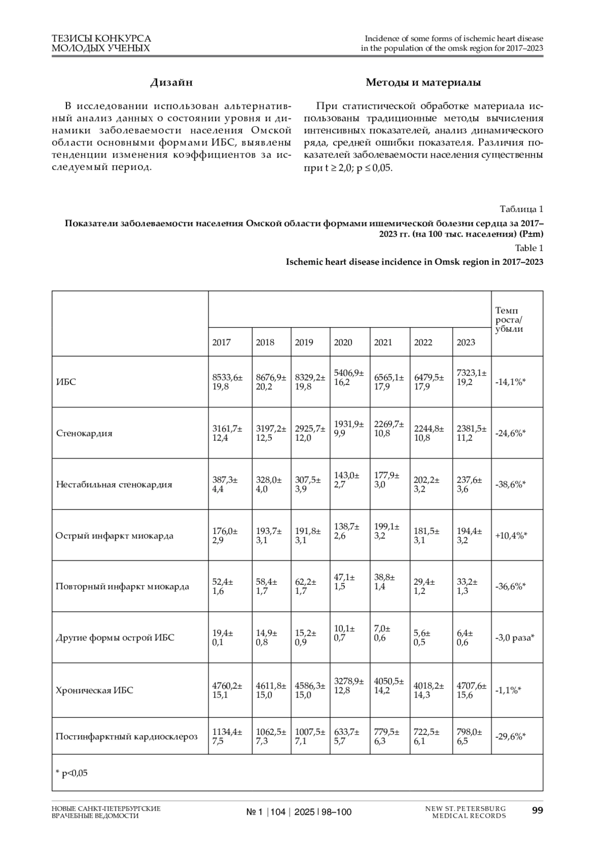 Изучить уровень и динамику заболеваемости населения Омской области некоторыми формами ишемической болезни сердца (ИБС) за 2017–2023 гг.