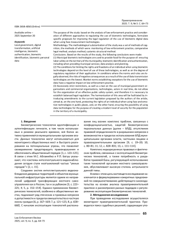 Рассмотрен российский и европейский подходы к регулированию технологий, использующих биометрические персональные данные. Выделены и проанализированы три ключевых направления применения биометрических технологий муниципальными органами власти: обеспечение безопасности; оказание муниципальных услуг; анализ данных и планирование. Выявлены проблемы правоприменения, связанные с несовершенством действующего законодательства, и предложены пути их устранения.