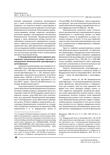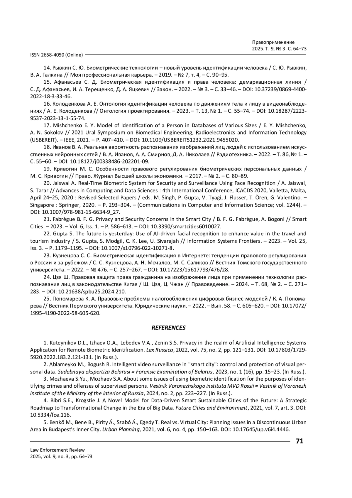 23. Кузнецова С. С. Биометрическая идентификация в Интернете: тенденции правового регулирования в России и за рубежом / С. С. Кузнецова, А. Н. Мочалов, М. С. Саликов // Вестник Томского государственного университета. - 2022. - № 476. - С. 257-267. - https://doi.org/10.17223/15617793/476/28.