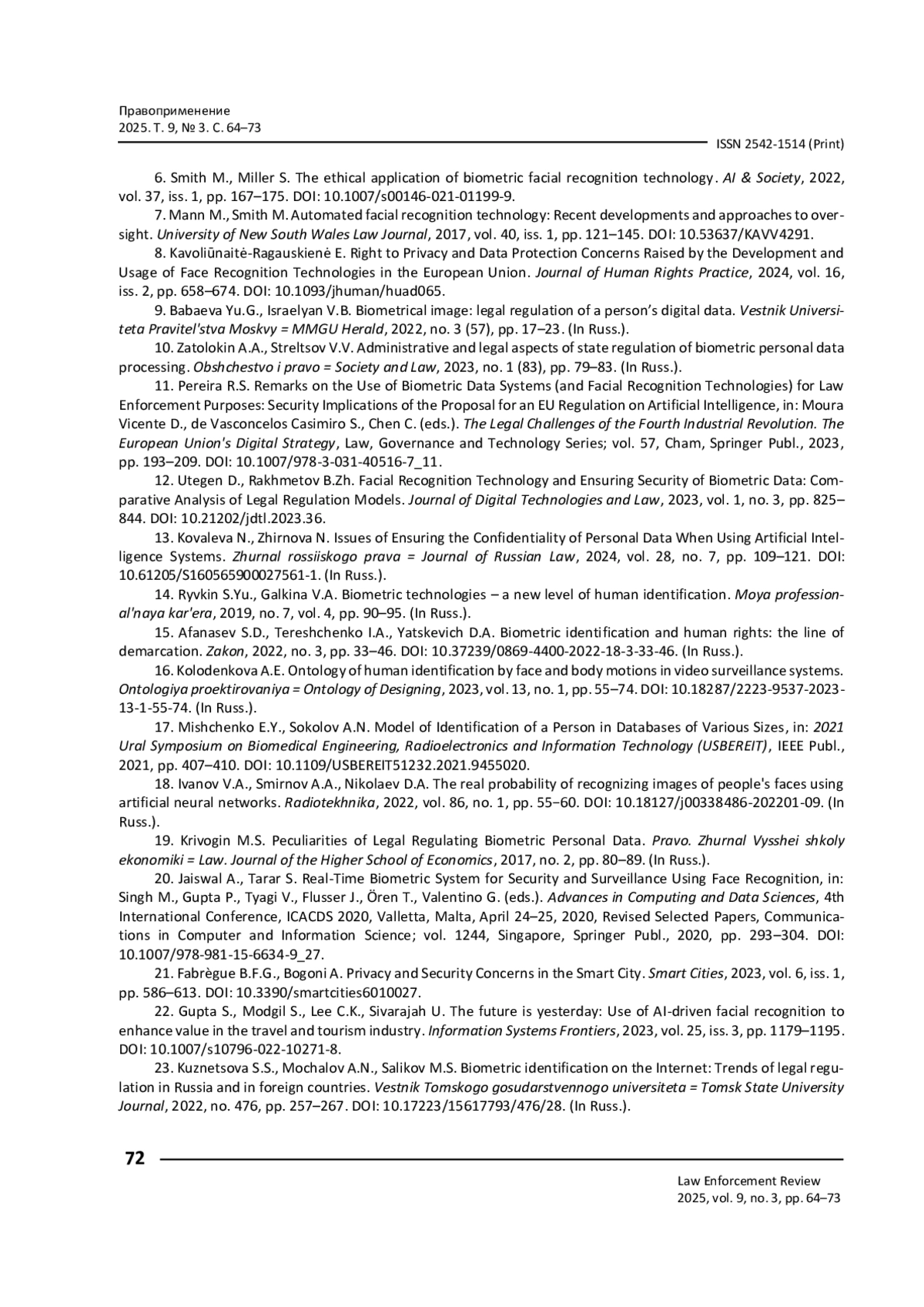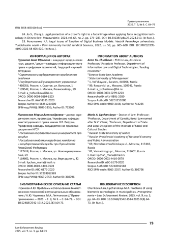 24. Цзя Ш. Правовая защита права гражданина на изображение лица при применении технологии распознавания лиц в законодательстве Китая / Ш. Цзя, Ц. Чжан // Правоведение. - 2024. - Т. 68, № 2. - С. 271-283. - https://doi.org/10.21638/spbu25.2024.210.