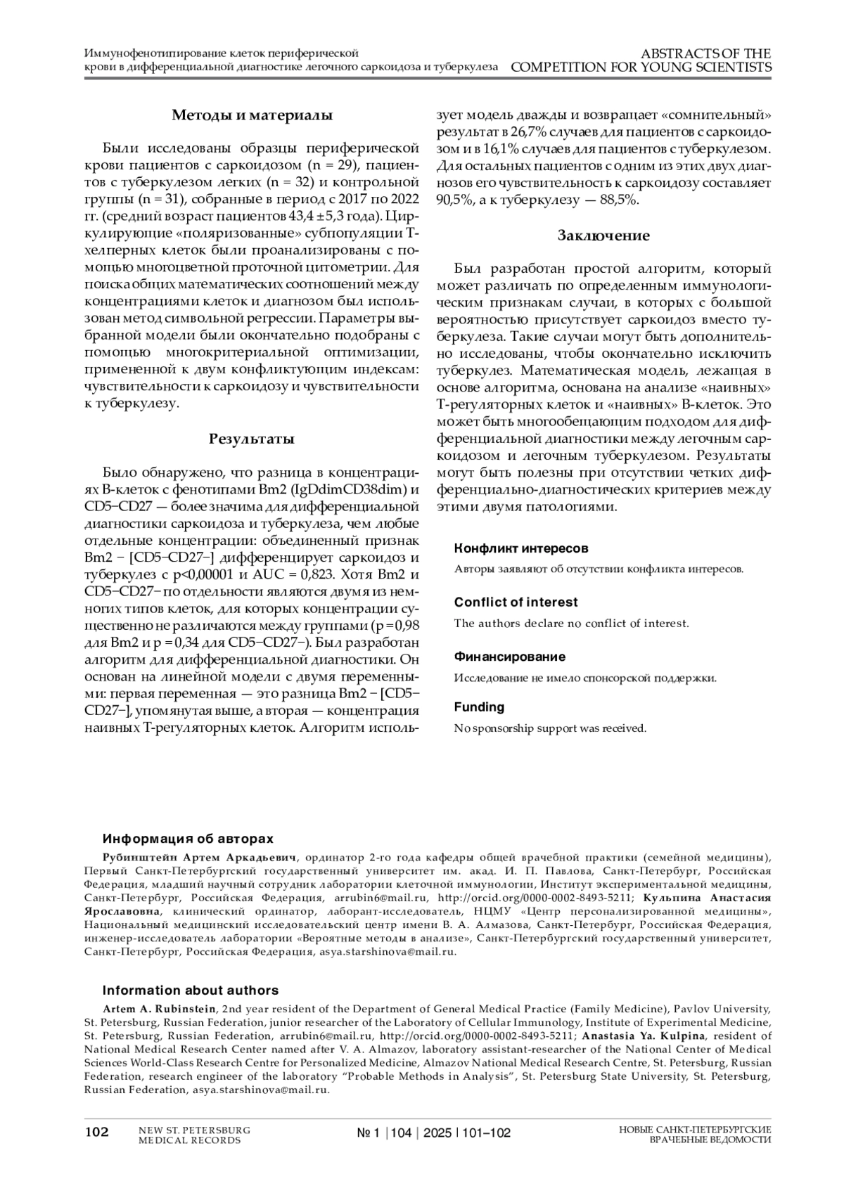 Целью нашего исследования является создание алгоритма дифференциальной диагностики легочного туберкулеза и саркоидоза на основе анализа фенотипических изменений клеток приобретенного иммунитета, циркулирующих в периферической крови.