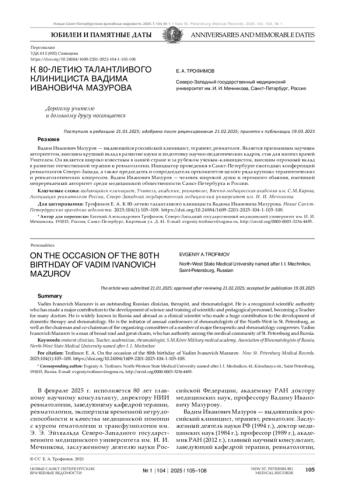 В феврале 2025 г. исполняется 80 лет главному научному консультанту, директору НИИ ревматологии, заведующему кафедрой терапии, ревматологии, экспертизы временной нетрудоспособности и качества медицинской помощи с курсом гематологии и трансфузиологии им. Э. Э. Эйхвальда Северо-Западного государственного медицинского университета им. И. И. Мечникова, заслуженному деятелю науки Российской Федерации, академику РАН доктору медицинских наук, профессору Вадиму Ивановичу Мазурову.