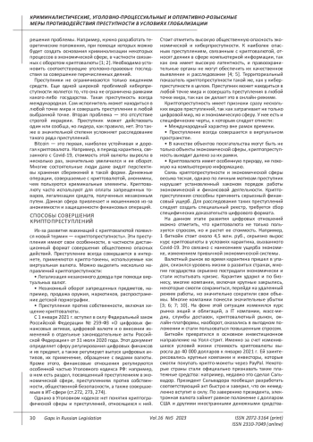 Целью данного исследования является изучение современного состояния оборота криптовалюты, преступлений в данной сфере и специфики их расследования. В мировой экономике все шире применяется технология блокчейна и используется криптовалюта. Применение современных технологий привлекательно и для финансовых организаций, которые вкладывают в их развитие деньги, используют электронную бухгалтерскую книгу и т. д., однако это дает новые возможности и киберпреступникам, которые осваивают технологии, позволяющие им нападать на финансовые организации и вымогать крупные суммы в результате таких атак. Криптовалюты дорожают во всем мире, набирают влияние и начинают существенно угрожать национальной безопасности страны. Многие международные законодатели отмечают, что на данный момент возникла ситуация, при которой преступники бесконтрольно выводят средства, полученные незаконным путем, за границу из национальных финансовых систем, переводя сначала деньги в электронный вид. Виртуальная валюта не имеет физического выражения, поэтому контролировать ее передвижение крайне сложно. Преступники не ограничиваются только хищением средств. Еще одной широкой проблемой киберпреступности является то, что она не ограничена рамками какого-либо государства. Такая преступность всегда международная. Сам исполнитель может находиться в любой точке мира и совершать преступление в любой выбранной точке. Вторая проблема - это отсутствие строгой иерархии. Преступник может действовать один или сообща, но лидера, как правило, нет. Это также в значительной степени усложняет расследование такого рода преступлений. Анализируя российскую и зарубежную практику, можно сделать вывод о том, что чем выше материально-технический прогресс, тем динамичнее развивается преступность в сфере высоких технологий, которая учится применять свои возможности в интернете. Например, появляется специальное программное обеспечение, которое способно защитить пользователя от фиксации его действий, сделать его полностью анонимным. Это отличные возможности для преступников, так как можно не оставлять следов, ведя нелегальную деятельность, пользуясь криптовалютой и добывая ее. Существует достаточно большой арсенал средств, применимых преступниками, что значительно усложняет противодействие им.