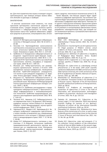 7. 	Родионов Е.А. Проблемы расследования и предупреждения киберпреступлений // Преступность в сфере информационных и телекоммуникационных технологий: проблемы предупреждения, раскрытия и расследования преступлений. 2022. № 8. С. 110-113. EDN: AFHMNZ