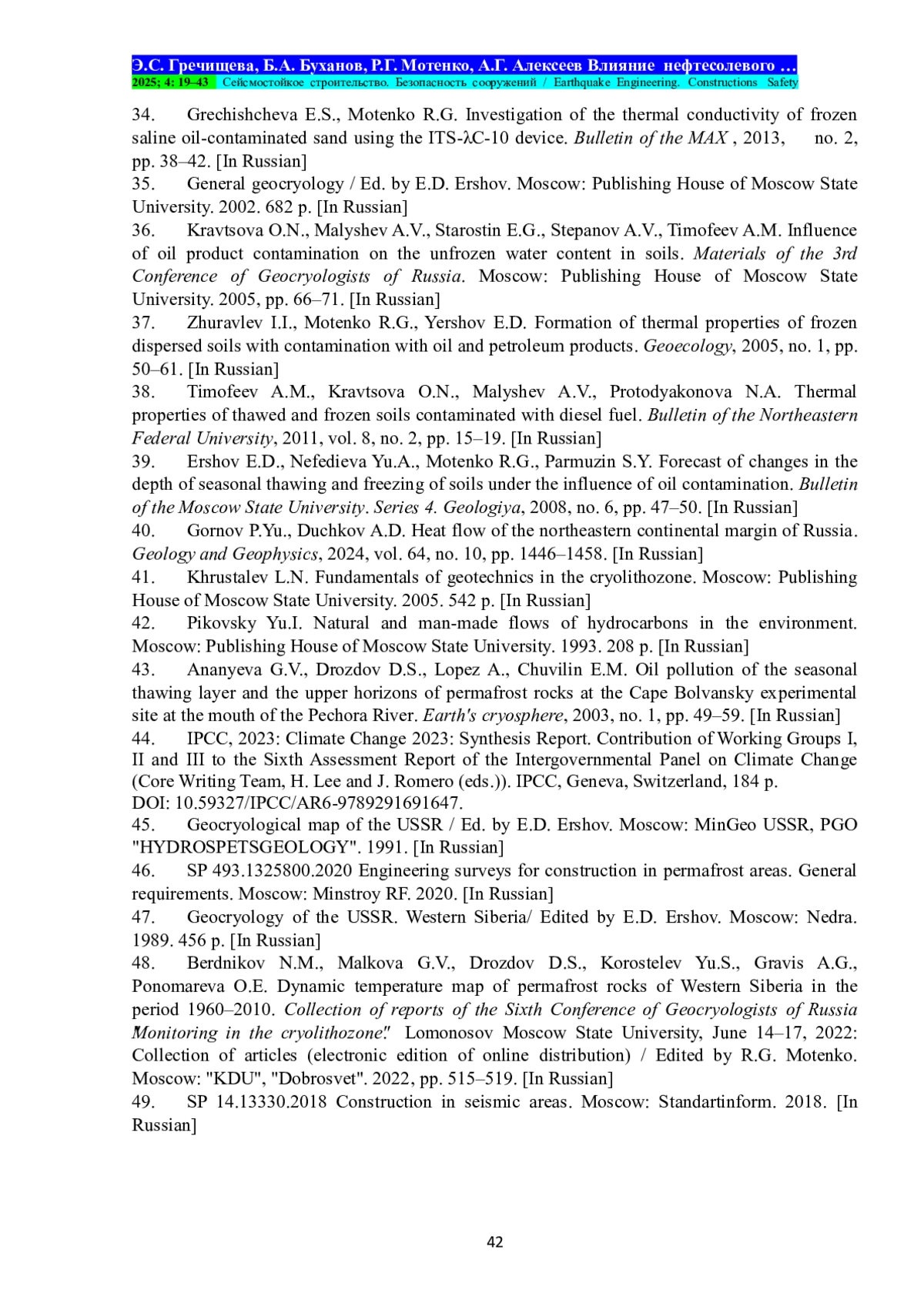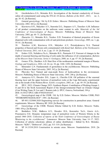 39. Ершов Э.Д., Нефедьева Ю.А., Мотенко Р.Г., Пармузин С.Ю. Прогноз изменения глубины сезонного оттаивания и промерзания грунтов под влиянием нефтяного загрязнения // Вестник МГУ. Серия 4. Геология. 2008. № 6. С. 47-50.